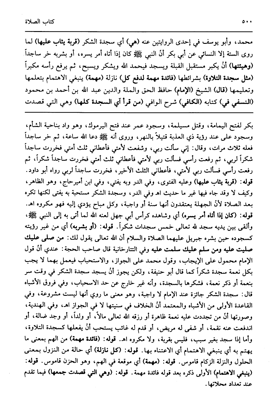 بكر لفتح اليمامة وقتل مسيلمة وسجود عمر عند فتح اليرموك وهو واد بناحية الشأم وسجود على عند رؤية ذي العذبة قتيلا بالنهر وروى أنه صلى الله عليه وسلم دعا الله ساعة ثم خر ساجدا فعله ثلاث مرات وقال إني سألت ربي وشفعت لأمتي فأعطاني ثلث أمتي فخررت ساجدا شكرا لربي ثم رفعت رأسي فسألت ربي لأمتي فأعطاني ثلث أمتي فخررت ساجدا شكرا ثم رفعت رأسي فسألت ربي لأمتي فأعطاني الثلث الأخير فخررت ساجدا لربي رواه أبو داود قوله: "قربة يثاب عليها" وعليه الفتوى وفي الدر وبه يفتي وفي ابن أميرحاج وهو الظاهر وكيف لا وقد جاء فيها غير ما حديث اهـ وفي الدر وسجدة الشكر مستحبة به يفتى لكنها تكره بعد الصلاة لأن الجهلة يعتقدون أنها سنة أو واجبة وكل مباح يؤدي إليه فهو مكروه اهـ قوله: "كان إذا أتاه أمر يسره" أي وشاهده كرأس أبي جهل لعنه الله لما أتى به إلى النبي صلى الله عليه وسلم وألقى بين يديه سجد لله تعالى خمس سجدات شكرا قوله: "أو بشربه" أي من غير رؤيته كسجوده حين بشره جبريل عليهما الصلاة والسلام أن الله تعالى يقول: لك من صلى عليك صليت عليه ومن سلم عليك سلمت عليه وفي التتارخانية قال صاحب الحجة عندي أن قول الإمام محمول على الإيجاب وقول محمد على الجواز والاستحباب فيعمل بهما لا يجب بكل نعمة سجدة شكرا كما قال أبو حنيفة ولكن يجوز أن يسجد سجدة الشكر في وقت سر بنعمة أو ذكر نعمة فشكرها بالسجدة وأنه غير خارج عن حد الاسحباب وفي فروق الأشباه قال سجدة الشكر جائزة عند الإمام لا واجبة وهو معنى ما روى أنها ليست مشروعة وفي القاعدة الأولى من الأشباه والمعتمد أن الخلاف في سنيتها لا في الجواز اهـ وفي الهندية وصورتها أن من تجددت عليه نعمة ظاهرة أو رزقه الله تعالى مالا أو ولدا أو وجد ضالة أو اندفعت عنه نقمة أو شفى له مريض أو قدم له غائب يستحب أن يفعلها كسجدة التلاوة وأما إذا سجد بغير سبب فليس بقربة ولا مكروه اهـ قوله: "فائدة مهمة" من الهم بمعنى ما يهتم به أي ينبغي الاهتمام أي الاعتناء بها قوله: "كل نازلة" أي حالة من النزول بمعنى الحلول والنزلة الزكام قاموس قوله: "مهمة" أي موقعة في الهم وهو الحزن قاموس قوله: "ينبغي الاهتمام" الأولى ذكره بعد قوله فائدة مهمة قوله: "وهي التي قصدت جمعها" فيما تقدم عند تعداد محلاتها