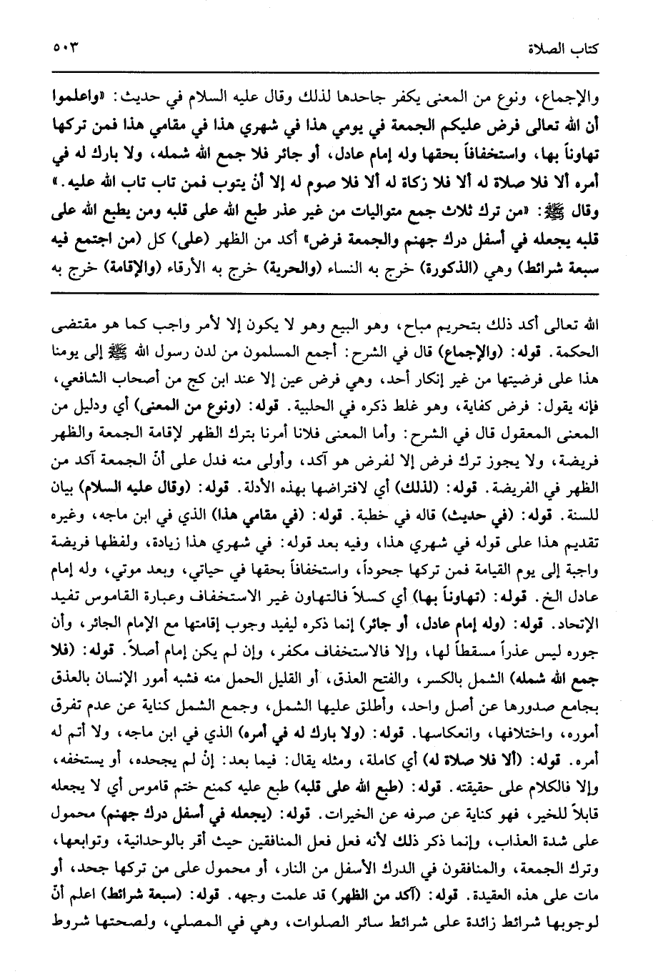 والإجماع ونوع من المعنى يكفر جاحدها لذلك. وقال عليه السلام في حديث: "وأعلم أن الله تعالى فرض عليكم الجمعة في يومي هذا في شهري هذا في مقامي هذا فمن تركها تهاونا بها واستخفافا وله إمام عادل أو جائر فلا جمع الله شمله ولا بارك له في أمره ألا فلا صلاة له ألا فلا زكاة له ألا فلا صوم له إلا أن يتوب فمن تاب تاب الله عليه" وقال صلى الله عليه وسلم: "من ترك ثلاث جمع متواليات من غير عذر طبع الله على قلبه ومن يطبع الله على قلبه يجعله في أسفل درك جهنم" والجمعة فرض آكد من الظهر "على" كل "من اجتمع فيه سبعة شرائط" وهي "الذكورة" خرج به النساء "والحرية" خرج به الأرقاء "والإقامة" خرج به
