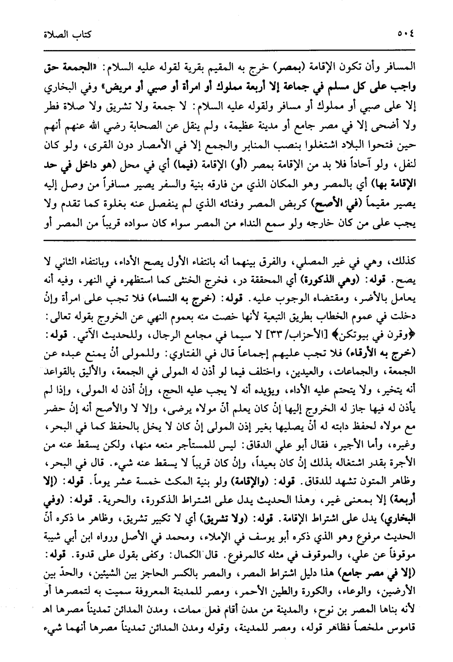 المسافر وأن تكون الإقامة "بمصر" خرج به المقيم بقرية لقوله عليه السلام: "الجمعة حق واجب على كل مسلم في جماعة إلا أربعة مملوك أو امرأة أو صبي أو مريض" وفي البخاري "إلا على صبي أو مملوك أو مسافر" ولقوله عليه السلام: "لا جمعة ولا تشريق ولا صلاة فطر ولا أضحى إلا في مصر جامع أو مدينة عظيمة" ولم ينقل عن الصحابة رضي الله عنهم أنهم حين فتحوا البلاد اشتغلوا بنصب المنابر والجمع إلا في الأمصار دون القرى ولو كان لنقل ولو آحادا فلا بد من الإقامة "أو" الإقامة "فيما" أي في محل "هو داخل في حد الإقامة بها" أي بالنص وهو المكان الذي من فارقه بنية السفر يصير مسافرا ومن وصل إليه يصير مقيما "في الأصح" كربض المصر وفنائه الذي لم ينفصل عنه بغلوة كما تقدم ولا يجب على من كان خارجه ولو سمع النداء من المصر سواء كان سواده قريبا من المصر أو
