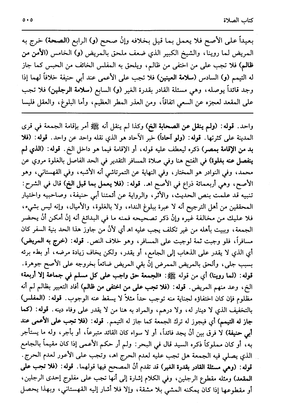 واحد قوله: "ولم ينقل عن الصحابة الخ" وكذا لم ينقل أنه صلى الله عليه وسلم أمر بإقامة الجمعة في قرى المدينة على كثرتها قوله: "ولو آحادا" خبر الآحاد هو الذي نقله واحد عن واحد قوله: "فلا بد من الإقامة بمصر" ذكره ليعطف عليه قوله أو الإقامة فيما هو داخل الخ قوله: "الذي لم ينفصل عنه بغلوة" في الفتح هنا وفي صلاة المسافر التقدير في الحد الفاصل بالغلوة مروي عن محمد وفي النوادر هو المختار وفي النهاية عن التمرتاشي أنه الأشبه وفي القهستاني وهو الأصح وهي أربعمائة ذراع في الأصح اهـ قوله: "فلا يعمل بما قيل الخ" قال في الشرح تنبيه قد علمت بنص الحديث والأثر والرواية عن أئمتنا أبي حنيفة وصاحبيه واختيار المحققين من أهل الترجيح أنه لا عبرة ببلوغ النداء ولا بالغلوة والأميال وإنه ليس بشيء فلا عليك من مخالفة غيره وإن ذكر تصحيحه فمنه ما في البدائغ أنه إن أمكن أن يحضر الجمعة وببيت بأهله من غير تكلف يجب عليه اهـ أي لأن من جاوز هذا الحد بنية السفر كان مسافرا فلو وجبت ثمة لوجبت على المسافر وهو خلاف النص قوله: "خرج به المريض" أي الذي لا يقدر على الذهاب إلى الجامع أو يقدر ولكن يخاف زيادة مرضه أو بطء برئه بسبب جلى وألحق بالمريض الممرض إن بقي المريض ضائعا بخروجه على الأصح جوهرة قوله: "لما روينا" أي من قوله صلى الله عليه وسلم: "الجمعة حق واجب على كل مسلم في جماعة إلا أربعة" الخ وعد منهم المريض قوله: "فلا تجب على من اختفى من ظالم" أفاد التعبير بظالم لم أنه مظلوم فإن كان اختفاؤه لجناية منه توجب حدا مثلا لا يسقط عنه الوجوب قوله: "المفلس" بالتخفيف الذي لا دينار له ولا درهم والمراد به هنا من لا يقدر على وفاء دينه قوله: "كما جاز له التيمم" أي فيجوز له ترك الجمعة كما جاز له التيمم قوله: "فلا تجب على الأعمى عند أبي حنيفة" لا فرق بين أن يجد فائدا أو لا سواء كان القائد متبرعا أو بأجر وله ما يستأجر به أو كان مملوكا ذكره السيد قال في البحر ولم أر حكم الأعمى إذا كان مقيما بالجامع الذي يصلي فيه الجمعة هل تجب عليه لعدم الحرج اهـ وتجب على الأعور لعدم الحرج قوله: "وهي مسئلة القادر بقدرة الغير" قد تقدم أن المصحح فيها قولهما قوله: "فلا تجب على المقعد" ومثله مقطوع الرجلين وفي الكلام إشارة إلى أنها تجب على مفلوج إحدى الرجلين أو مقطوعها إذا كان يمكنه المشي بلا مشقة وإلا فلا أشار إليه القهستاني وبهذا يحصل
