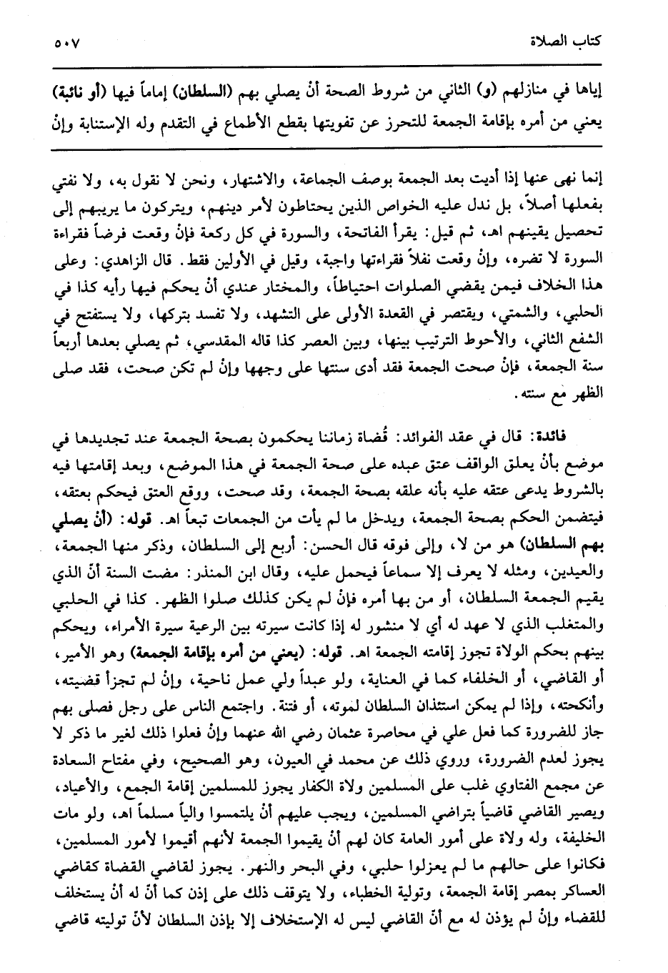 فائدة قال في عقد الفوائد قضاة زماننا يحكمون بصحة الجمعة عند تجديدها في موضع بأن يعلق الواقف عتق عبده على صحة الجمعة في هذا الموضع وبعد إقامتها فيه بالشروط يدعى عتقه عليه بأنه علقه بصحة الجمعة وقد صحت ووقع العتق فيحكم بعتقه فيتضمن الحكم بصحة الجمعة ويدخل ما لم يأت من الجمعات تبعا اهـ قوله: "أن يصلي بهم السلطان" هو من لا وإلى فوقه قال الحسن أربع إلى السلطان وذكر منها الجمعة والعيدين ومثله لا يعرف إلا سماعا فيحمل عليه وقال ابن المنذر مضت السنة أن الذي يقيم الجمعة السلطان أو من بها أمره فإن لم يكن كذلك صلوا الظهر كذا في الحلبي والمتغلب الذي لا عهد له أي لا منشور له إذا كانت سيرته بين الرعية سيرة الأمراء ويحكم بينهم بحكم الولاة تجوز إقامته الجمعة اهـ قوله: "يعني من أمره بإقامة الجمعة" وهو الأمير أو القاضي أو الخلفاء كما في العناية ولو عبدا ولي عمل ناحية وإن لم تجزأ قضيته وأنكحته وإذا لم يمكن استئذان السلطان لموته أو فتنة واجتمع الناس على رجل فصلى بهم جاز للضرورة كما فعل علي في محاصرة عثمان رضي الله عنهما وإن فعلوا ذلك لغير ما ذكر لا يجوز لعدم الضرورة وروي ذلك عن محمد في العيون وهو الصحيح وفي مفتاح السعادة عن مجمع الفتاوي غلب على المسلمين ولاة الكفار يجوز للمسلمين إقامة الجمع والأعياد ويصير القاضي قاضيا بتراضي المسلمين ويجب عليهم أن يلتمسوا واليا مسلما اهـ ولو مات الخليفة وله ولاة على أمور العامة كان لهم أن يقيموا الجمعة لأنهم أقيموا لأمور المسلمين فكانوا على حالهم ما لم يعزلوا حلبي وفي البحر والنهر يجوز لقاضي القضاة كقاضي العساكر بمصر إقامة الجمعة وتولية الخطباء ولا يتوقف ذلك على إذن كما أن له أن يستخلف للقضاء وإن لم يؤذن له مع أن القاضي ليس له الإستخلاف إلا بإذن السلطان لأن توليته قاضي