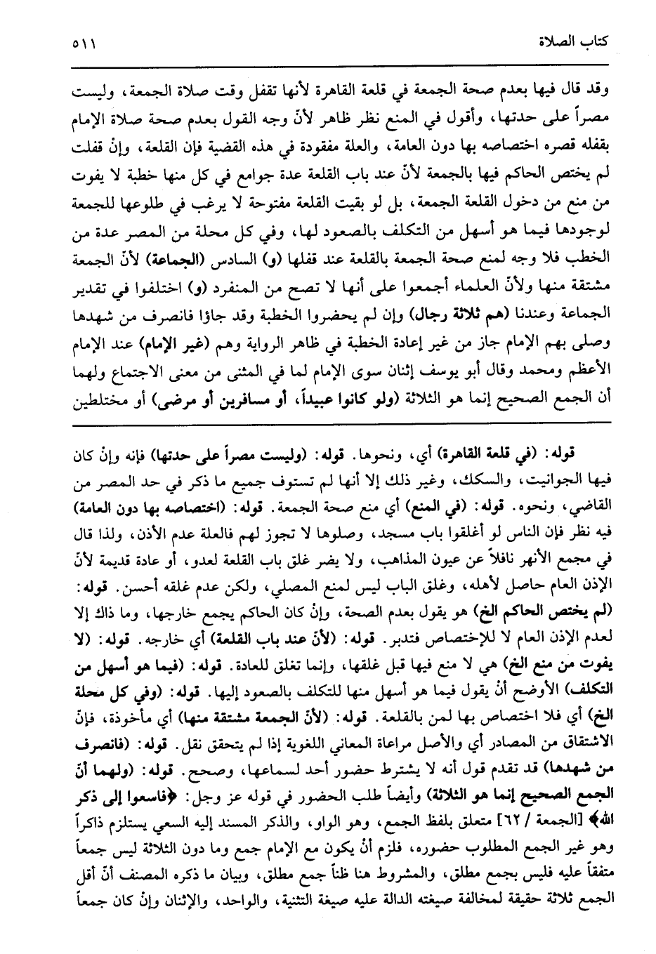 وقد قال فيها بعدم صحة الجمعة في قلعة القاهرة لأنها تقفل وقت صلاة الجمعة وليست مصرا على حدتها. وأقول في المنع نظر ظاهر لأن وجه القول بعدم صحة صلاة الإمام بقفله قصره اختصاصه بها دون العامة والعلة مفقودة في هذه القضية فإن القلعة وإن قفلت لم يختص الحاكم فيها بالجمعة لأن عند باب القلعة عدة جوامع في كل منها خطبة لا يفوت من منع من دخول القلعة الجمعة بل لو بقيت القلعة مفتوحة لا يرغب في طلوعها للجمعة لوجودها فيما هو أسهل من التكلف بالصعود لها وفي كل محلة من المصر عدة من الخطب فلا وجه لمنع صحة الجمعة بالقلعة عند قفلها "و" السادس "الجماعة" لأن الجمعة مشتقة منها ولأن العلماء أجمعوا على أنها لا تصح من المنفرد "و" واختلفوا في تقدير الجماعة فعندنا "هم ثلاثة رجال" وإن لم يحضروا الخطبة وقد جاءوا فإن صرف من شهدها وصلى بهم الإمام جاز من غير إعادة الخطبة في ظاهر الرواية وهم "غير الإمام" عند الإمام الأعظم ومحمد وقال أبو يوسف اثنان سوى الإمام لما في المثنى من معنى الاجتماع ولهما إن الجمع الصحيح إنما هو الثلاثة "وكانوا عبيدا أو مسافرين أو مرضى" أو مختلطين