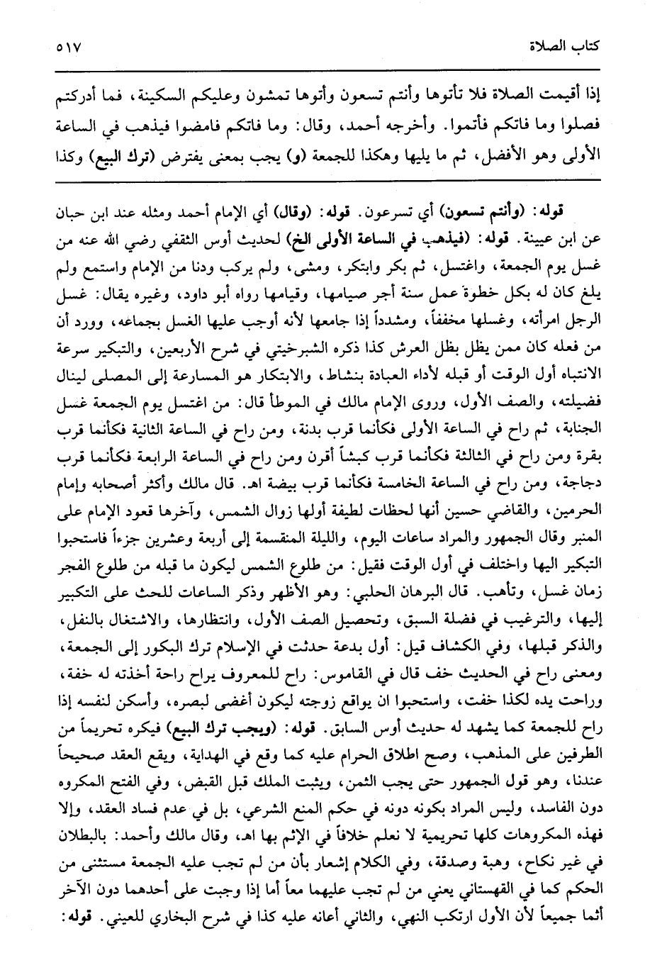 قوله: "وأنتم تسعون" أي تسرعون قوله: "وقال" أي الإمام أحمد ومثله عند ابن حبان عن ابن عيينة قوله: "فيذهب في الساعة الأولى الخ" لحديث أوس الثقفي رضي الله عنه من غسل يوم الجمعة واغتسل ثم بكر وابتكر ومشى ولم يركب ودنا من الإمام واستمع ولم يلغ كان له بكل خطوة عمل سنة أجر صيامها وقيامها رواه أبو داود وغيره يقال غسل الرجل امرأته وغسلها مخففا ومشددا إذا جامعها لأنه أوجب عليها الغسل بجماعه وورد أن من فعله كان ممن يظل بظل العرش كذا ذكره الشبرخيتي في شرح الأربعين والتبكير سرعة الانتباه أول الوقت أو قبله لأداء العبادة بنشاط والابتكار هو المسارعة إلى المصلى لينال فضيلته والصف الأول وروى الإمام مالك في الموطأ قال من اغتسل يوم الجمعة غسل الجنابة ثم راح في الساعة الأولى فكأنما قرب بدنة ومن راح في الساعة الثانية فكأنما قرب بقرة ومن راح في الثالثة فكأنما قرب كبشا أقرن ومن راح في الساعة الرابعة فكأنما قرب دجاجة ومن راح في الساعة الخامسة فكأنما قرب بيضة اهـ قال مالك وأكثر أصحابه وإمام الحرمين والقاضي حسين أنها لحظات لطيفة أولها زوال الشمس وآخرها قعود الإمام على المنبر وقال الجمهور والمراد ساعات اليوم والليلة المنقسمة إلى أربعة وعشرين جزءا فاستحبوا التبكير اليها واختلف في أول الوقت فقيل من طلوع الشمس ليكون ما قبله من طلوع الفجر زمان غسل وتأهب قال البرهان الحلبي وهو الأظهر وذكر الساعات للحث على التبكير إليها والترغيب في فضلة السبق وتحصيل الصف الأول وانتظارها والاشتغال بالنفل والذكر قبلها وفي الكشاف قيل أول بدعة حدثت في الإسلام ترك البكور إلى الجمعة ومعنى راح في الحديث خف قال في القاموس راح للمعروف يراح راحة أخذته له خفة وراحت يده لكذا خفت واستحبوا ان يواقع زوجته ليكون أغض لبصره وأسكن لنفسه إذا راح للجمعة كما يشهد له حديث أوس السابق قوله: "ويجب ترك البيع" فيكره تحريما من الطرفين على المذهب وصح اطلاق الحرام عليه كما وقع في الهداية ويقع العقد صحيحا عندنا وهو قول الجمهور حتى يجب الثمن ويثبت الملك قبل القبض وفي الفتح المكروه دون الفاسد وليس المراد بكونه دونه في حكم المنع الشرعي بل في عدم فساد العقد وإلا فهذه المكروهات كلها تحريمية لا نعلم خلافا في الإثم بها اهـ وقال مالك وأحمد بالبطلان في غير نكاح وهبة وصدقة وفي الكلام إشعار بأن من لم تجب عليه الجمعة مستثنى من الحكم كما في القهستاني يعني من لم تجب عليهما معا أما إذا وجبت على أحدهما دون الآخر أثما جميعا لأن الأول ارتكب النهي والثاني أعانه عليه كذا في شرح البخاري للعيني قوله: