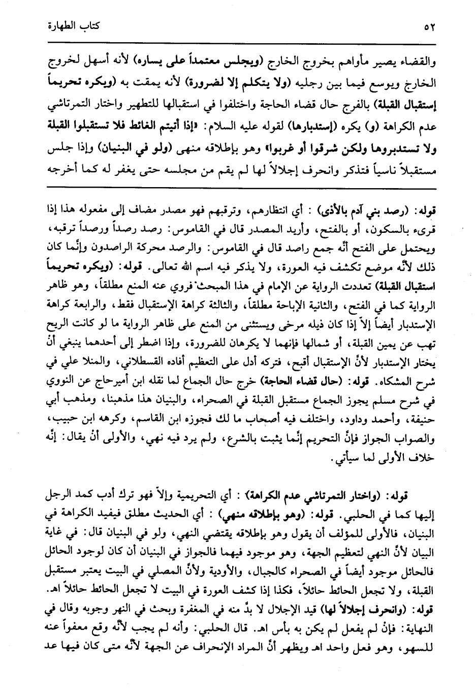 والفضاء يصير مأواهم بخروج الخارج "ويجلس معتمدا على يساره" لأنه أسهل لخروج الخارج ويوسع في ما بين رجليه "ولا يتكلم إلا لضرورة" لأنه يمقت به "ويكره تحريما استقبال القبلة" بالفرج حال قضاء الحاجة واختلفوا في استقبالها للتطهير واختار التمرتاشي عدم الكراهة "و" يكره "استدبارها" لقوله عليه السلام: "إذا أتيتم الغائط فلا تستقبلوا القبلة ولا تستدبروها ولكن شرقوا أو غربوا" وهو بإطلاقه منهي عنه "ولو في البنيان" وإذا جلس مستقبلا ناسيا فتذكر وانحرف إجلالا لها لم يقم من مجلسه حتى يغفر له كما أخرجه.