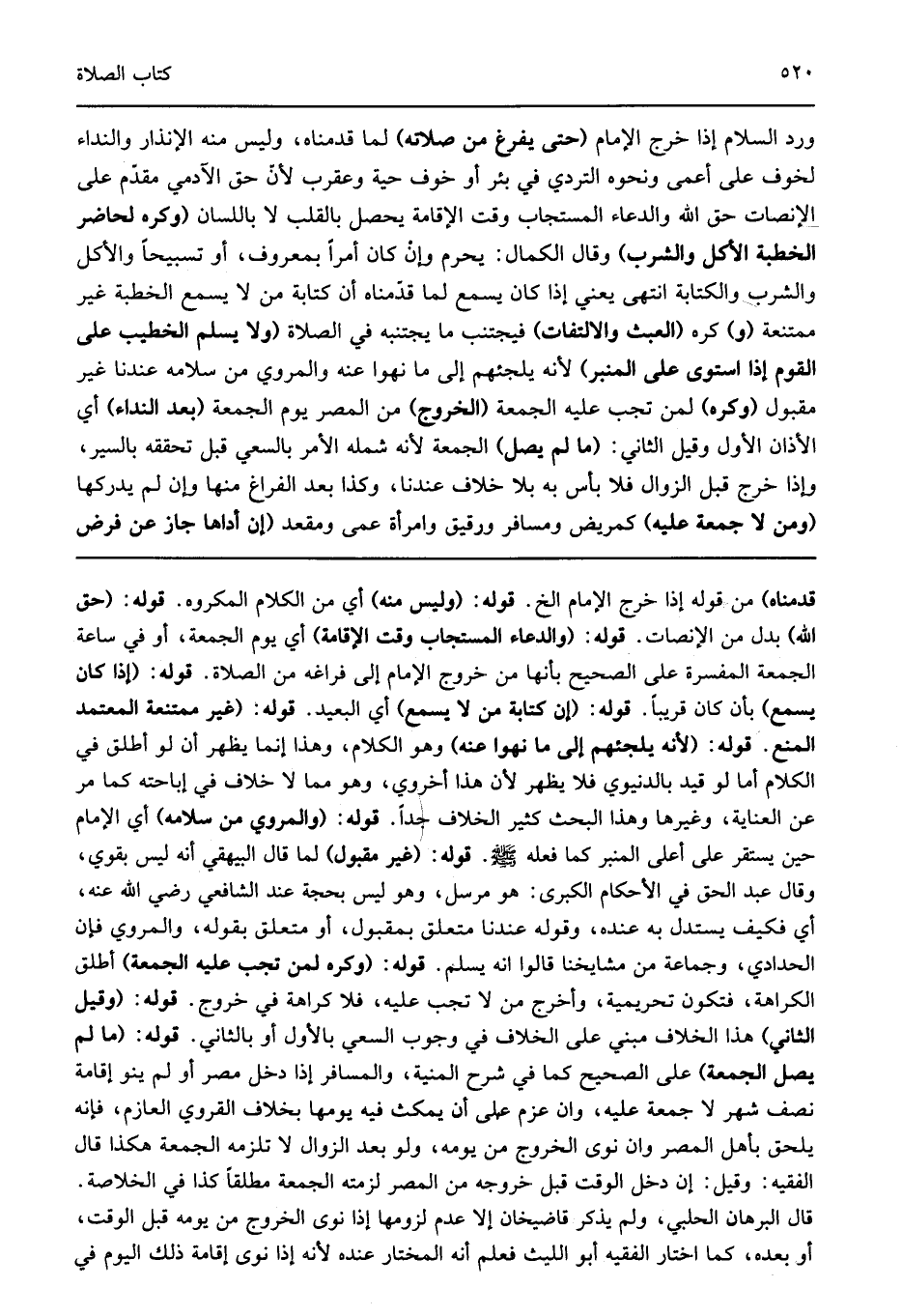 قدمناه" من قوله إذا خرج الإمام الخ قوله: "وليس منه" أي من الكلام المكروه قوله: "حق الله" بدل من الإنصات قوله: "والدعاء المستجاب وقت الإقامة" أي يوم الجمعة أو في ساعة الجمعة المفسرة على الصحيح بأنها من خروج الإمام إلى فراغه من الصلاة قوله: "إذا كان يسمع" بأن كان قريبا قوله: "إن كتابة من لا يسمع" أي البعيد قوله: غير ممتنعة المعتمد المنع قوله: "لأنه يلجئهم إلى ما نهوا عنه" وهو الكلام وهذا إنما يظهر أن لو أطلق في الكلام أما لو قيد بالدنيوي فلا يظهر لأن هذا أخروي وهو مما لا خلاف في إباحته كما مر عن العناية وغيرها وهذا البحث كثير الخلاف جدا قوله: "والمروي من سلامه" أي الإمام حين يستقر على أعلى المنبر كما فعله صلى الله عليه وسلم قوله: "غير مقبول" لما قال البيهقي أنه ليس بقوي وقال عبد الحق في الأحكام الكبرى هو مرسل وهو ليس بحجة عند الشافعي رضي الله عنه أي فكيف يستدل به عنده وقوله عندنا متعلق بمقبول أو متعلق بقوله والمروي فإن الحدادي وجماعة من مشايخنا قالوا: انه يسلم قوله: "وكره لمن تجب عليه الجمعة" أطلق الكراهة فتكون تحريمية وأخرج من لا تجب عليه فلا كراهة في خروج قوله: "وقيل الثاني" هذا الخلاف مبني على الخلاف في وجوب السعي بالأول أو بالثاني قوله: "ما لم يصل الجمعة" على الصحيح كما في شرح المنية والمسافر إذا دخل مصر أو لم ينو إقامة نصف شهر لا جمعة عليه وان عزم على أن يمكث فيه يومها بخلاف القروي العازم فإنه يلحق بأهل المصر وان نوى الخروج من يومه ولو بعد الزوال لا تلزمه الجمعة هكذا قال الفقيه وقيل إن دخل الوقت قبل خروجه من المصر لزمته الجمعة مطلقا كذا في الخلاصة قال البرهان الحلبي ولم يذكر قاضيخان إلا عدم لزومها إذا نوى الخروج من يومه قبل الوقت أو بعده كما اختار الفقيه أبو الليث فعلم أنه المختار عنده لأنه إذا نوى إقامة ذلك اليوم في