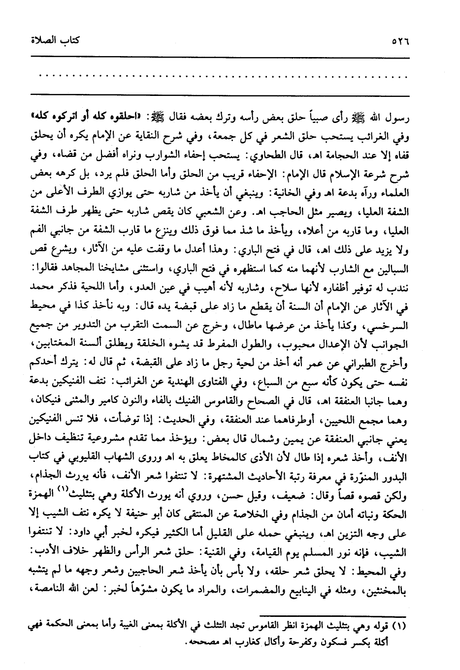 رسول الله صلى الله عليه وسلم رأى صبيا حلق بعض رأسه وترك بعضه فقال صلى الله عليه وسلم: "احلقوه كله أو اتركوه كله" وفي الغرائب يستحب حلق الشعر في كل جمعة وفي شرح النقاية عن الإمام يكره أن يحلق قفاه إلا عند الحجامة اهـ قال الطحاوي يستحب إحفاء الشوارب ونراه أفضل من قضاه وفي شرح شرعة الإسلام قال الإمام الإحفاء قريب من الحلق وأما الحلق فلم يرد بل كرهه بعض العلماء ورآه بدعة اهـ وفي الخانية وينبغي أن يأخذ من شاربه حتى يوازي الطرف الأعلى من الشفة العليا ويصير مثل الحاجب اهـ وعن الشعبي كان يقص شاربه حتى يظهر طرف الشفة العليا وما قاربه من أعلاه ويأخذ ما شذ مما فوق ذلك وينزع ما قارب الشفة من جانبي الفم ولا يزيد على ذلك اهـ قال في فتح الباري وهذا أعدل ما وقفت عليه من الآثار ويشرع قص السبالين مع الشارب لأنهما منه كما استظهره في فتح الباري واستثنى مشايخنا المجاهد فقالوا: نندب له توفير أظفاره لأنها سلاح وشاربه لأنه أهيب في عين العدو وأما اللحية فذكر محمد في الآثار عن الإمام أن السنة أن يقطع ما زاد على قبضة يده قال وبه نأخذ كذا في محيط السرخسي وكذا يأخذ من عرضها ماطال وخرج عن السمت التقرب من التدوير من جميع الجوانب لأن الإعدال محبوب والطول المفرط قد يشوه الخلقة ويطلق ألسنة المغتابين وأخرج الطبراني عن عمر أنه أخذ من لحية رجل ما زاد على القبضة ثم قال له يترك أحدكم نفسه حتى يكون كأنه سبع من السباع وفي الفتاوى الهندية عن الغرائب نتف الفنيكين بدعة وهما جانبا العنفقة اهـ قال في الصحاح والقاموس الفنيك بالفاء والنون كامير والمثنى فنيكان وهما مجمع اللحيين أوطرفاهما عند العنفقة وفي الحديث إذا توضأت فلا تنس الفنيكين يعني جانبي العنفقة عن يمين وشمال قال بعض ويؤخذ مما تقدم مشروعية تنظيف داخل الأنف وأخذ شعره إذا طال لأن الأذى كالمخاط يعلق به اهـ وروى الشهاب القليوبي في كتاب البدور المنورة في معرفة رتبة الأحاديث المشتهرة لا تنتفوا شعر الأنف فأنه يورث الجذام ولكن قصوه قصا وقال ضعيف وقيل حسن وروي أنه يورث الأكلة وهي بتثليث1 الهمزة الحكة ونباته أمان من الجذام وفي الخلاصة عن المنتقى كان أبو حنيفة لا يكره نتف الشيب إلا على وجه التزين اهـ وينبغي حمله على القليل أما الكثير فيكره لخبر أبي داود لا تنتفوا الشيب فإنه نور المسلم يوم القيامة وفي القنية حلق شعر الرأس والظهر خلاف الأدب وفي المحيط لا يحلق شعر حلقه ولا بأس بأن يأخذ شعر الحاجبين وشعر وجهه ما لم يتشبه بالمخنثين ومثله في الينابيع والمضمرات والمراد ما يكون مشوها لخبر لعن الله النامصة