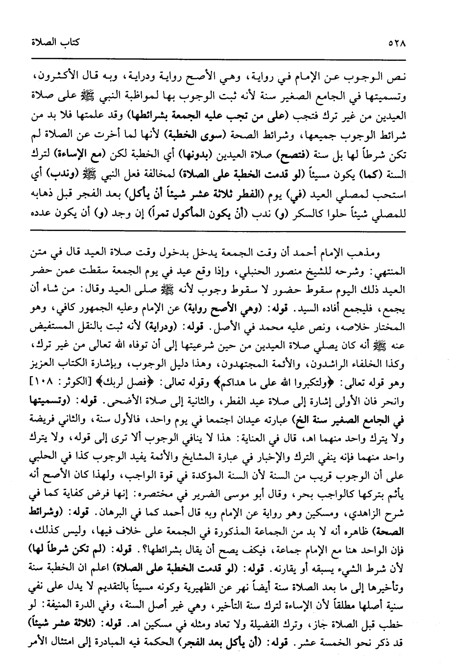 ومذهب الإمام أحمد أن وقت الجمعة يدخل بدخول وقت صلاة العيد قال في متن المنتهي وشرحه للشيخ منصور الحنبلي وإذا وقع عيد في يوم الجمعة سقطت عمن حضر العيد ذلك اليوم سقوط حضور لا سقوط وجوب لأنه صلى الله عليه وسلم صلى العيد وقال: "من شاء أن يجمع فليجمع" أفاده السيد قوله: "وهي الأصح رواية" عن الإمام وعليه الجمهور كافي وهو المختار خلاصه ونص عليه محمد في الأصل قوله: "ودراية" لأنه ثبت بالنقل المستفيض عنه صلى الله عليه وسلم أنه كان يصلي صلاة العيدين من حين شرعيتها إلى أن توفاه الله تعالى من غير ترك وكذا الخلفاء الراشدون والأئمة المجتهدون وهذا دليل الوجوب وبإشارة الكتاب العزيز وهو قوله تعالى: {وَلِتُكَبِّرُوا اللَّهَ عَلَى مَا هَدَاكُمْ} وقوله تعالى: {فَصَلِّ لِرَبِّكَ} [الكوثر: 2] فان الأولى إشارة إلى صلاة عيد الفطر والثانية إلى صلاة الأضحى قوله: "وتسميتها في الجامع الصغير سنة الخ" عبارته عيدان اجتمعا في يوم واحد فالأول سنة والثاني فريضة ولا يترك واحد منهما اهـ قال في العناية هذا لا ينافي الوجوب ألا ترى إلى قوله ولا يترك واحد منهما فإنه ينفي الترك والإخبار في عبارة المشايخ والأئمة يفيد الوجوب كذا في الحلبي على أن الوجوب قريب من السنة لأن السنة المؤكدة في قوة الواجب ولهذا كان الأصح أنه يأثم بتركها كالواجب بحر وقال أبو موسى الضرير في مختصره إنها فرض كفاية كما في شرح الزاهدي ومسكين وهو رواية عن الإمام وبه قال أحمد كما في البرهان قوله: "وشرائط الصحة" ظاهره أنه لا بد من الجماعة المذكورة في الجمعة على خلاف فيها وليس كذلك فإن الواحد هنا مع الإمام جماعة فيكف يصح أن يقال بشرائطها قوله: "لم تكن شرطا لها" لأن شرط الشيء يسبقه أو يقارنه قوله: "لو قدمت الخطبة على الصلاة" اعلم ان الخطبة سنة وتأخيرها إلى ما بعد الصلاة سنة أيضا نهر عن الظهيرية وكونه مسيئا بالتقديم لا يدل على نفي سنية أصلها مطلقا لأن الإساءة لترك سنة التأخير وهي غير أصل السنة وفي الدرة المنيفة لو خطب قبل الصلاة جاز وترك الفضيلة ولا تعاد ومثله في مسكين اهـ قوله: "ثلاثة عشر شيئا" قد ذكر نحو الخمسة عشر قوله: "أن يأكل بعد الفجر" الحكمة فيه المبادرة إلى امتثال الأمر