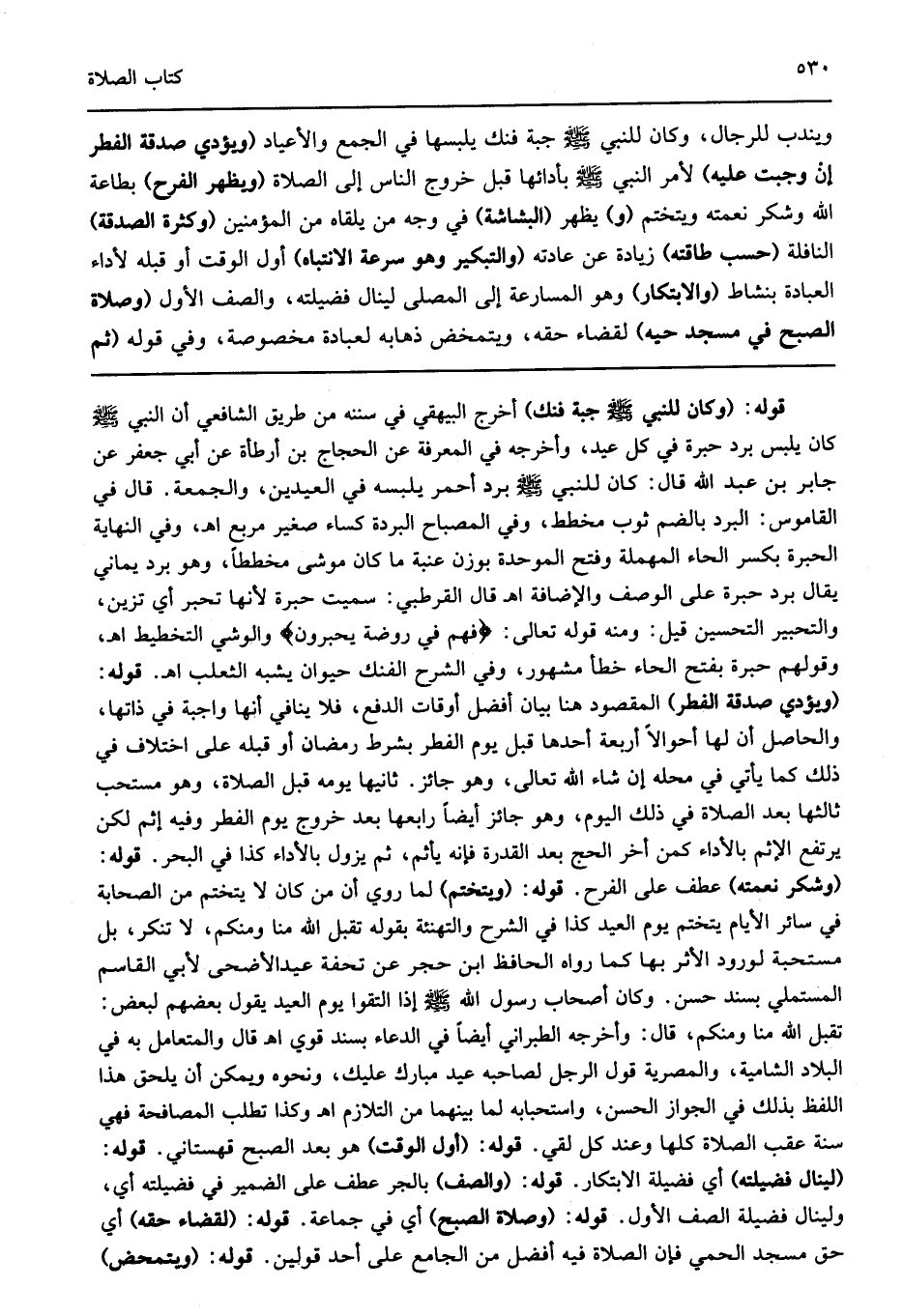 قوله: "وكان للنبي صلى الله عليه وسلم جبة فنك" أخرج البيهقي في سننه من طريق الشافعي أن النبي صلى الله عليه وسلم كان يلبس برد حبرة في كل عيد وأخرجه في المعرفة عن الحجاج بن أرطأة عن أبي جعفر عن جابر بن عبد الله قال كان للنبي صلى الله عليه وسلم برد أحمر يلبسه في العيدين والجمعة قال في القاموس البرد بالضم ثوب مخطط وفي المصباح البردة كساء صغير مربع اهـ وفي النهاية الحبرة بكسر الحاء المهملة وفتح الموحدة بوزن عنبة ما كان موشى مخططا وهو برد يماني يقال برد حبرة على الوصف والإضافة اهـ قال القرطبي سميت حبرة لأنها تحبر أي تزين والتحبير التحسين قيل ومنه قوله تعالى: {فَهُمْ فِي رَوْضَةٍ يُحْبَرُونَ} والوشي التخطيط اهـ وقولهم حبرة بفتح الحاء خطأ مشهور وفي الشرح الفنك حيوان يشبه الثعلب اهـ قوله: "ويؤدي صدقة الفطر" المقصود هنا بيان أفضل أوقات الدفع فلا ينافي أنها واجبة في ذاتها والحاصل أن لها أحوالا أربعة أحدها قبل يوم الفطر بشرط رمضان أو قبله على اختلاف في ذلك كما يأتي في محله إن شاء الله تعالى وهو جائز ثانيها يومه قبل الصلاة وهو مستحب ثالثها بعد الصلاة في ذلك اليوم وهو جائز أيضا رابعها بعد خروج يوم الفطر وفيه إثم لكن يرتفع الإثم بالأداء كمن أخر الحج بعد القدرة فإنه يأثم ثم يزول بالأداء كذا في البحر قوله: "وشكر نعمته" عطف على الفرح قوله: "ويتختم" لما روي أن من كان لا يتختم من الصحابة في سائر الأيام يتختم يوم العيد كذا في الشرح والتهنئة بقوله تقبل الله منا ومنكم لا تنكر بل مستحبة لورود الأثر بها كما رواه الحافظ ابن حجر عن تحفة عيدالأضحى لأبي القاسم المستملي بسند حسن وكان أصحاب رسول الله صلى الله عليه وسلم إذا التقوا يوم العيد يقول بعضهم لبعض تقبل الله منا ومنكم قال وأخرجه الطبراني أيضا في الدعاء بسند قوي اهـ قال والمتعامل به في البلاد الشامية والمصرية قول الرجل لصاحبه عيد مبارك عليك ونحوه ويمكن أن يلحق هذا اللفظ بذلك في الجواز الحسن واستحبابه لما بينهما من التلازم اهـ وكذا تطلب المصافحة فهي سنة عقب الصلاة كلها وعند كل لقي قوله: "أول الوقت" هو بعد الصبح قهستاني قوله: "لينال فضيلته" أي فضيلة الابتكار قوله: "والصف" بالجر عطف على الضمير في فضيلته أي ولينال فضيلة الصف الأول قوله: "وصلاة الصبح" أي في جماعة قوله: "لقضاء حقه" أي حق مسجد الحمي فإن الصلاة فيه أفضل من الجامع على أحد قولين قوله: "ويتمحض"