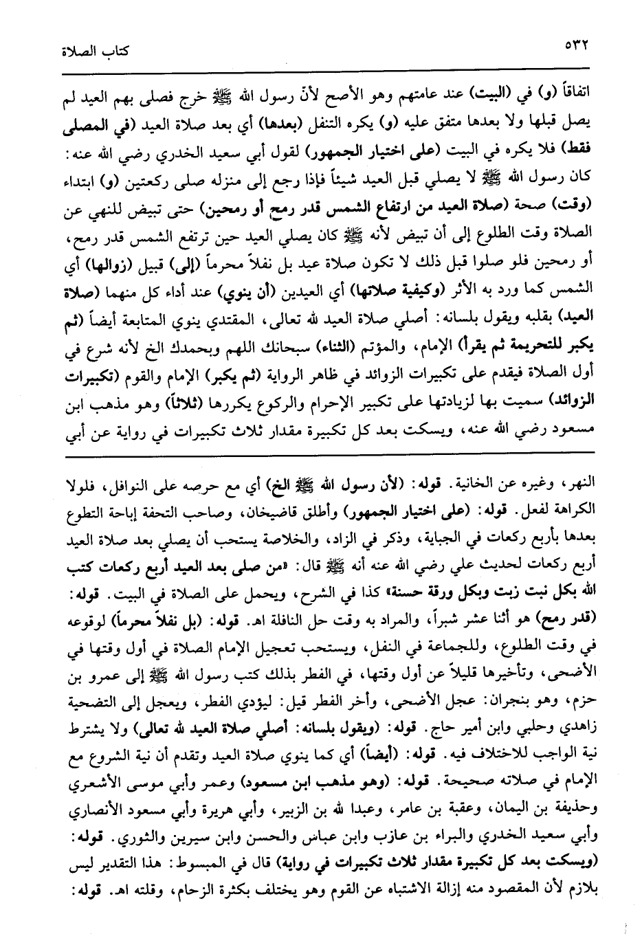 النهر وغيره عن الخانية قوله: "لأن رسول الله صلى الله عليه وسلم الخ" أي مع حرصه على النوافل فلولا الكراهة لفعل قوله: "على اختيار الجمهور" وأطلق قاضيخان وصاحب التحفة إباحة التطوع بعدها بأربع ركعات في الجباية وذكر في الزاد والخلاصة يستحب أن يصلي بعد صلاة العيد أربع ركعات لحديث علي رضي الله عنه أنه صلى الله عليه وسلم قال: "من صلى بعد العيد أربع ركعات كتب الله بكل نبت نبت وبكل ورقة حسنة" كذا في الشرح ويحمل على الصلاة في البيت قوله: "قدر رمح" هو أثنا عشر شبرا والمراد به وقت حل النافلة اهـ قوله: "بل نفلا محرما" لوقوعه في وقت الطلوع وللجماعة في النفل ويستحب تعجيل الإمام الصلاة في أول وقتها في الأضحى وتأخيرها قليلا عن أول وقتها في الفطر بذلك كتب رسول الله صلى الله عليه وسلم إلى عمرو بن حزم وهو بنجران عجل الأضحى وأخر الفطر قيل ليؤدي الفطر ويعجل إلى التضحية زاهدي وحلبي وابن أمير حاج قوله: "ويقول بلسانه أصلى صلاة العيد لله تعالى" ولا يشترط نية الواجب للاختلاف فيه قوله: "أيضا" أي كما ينوي صلاة العيد وتقدم أن نية الشروع مع الإمام في صلاته صحيحة قوله: "وهو مذهب ابن مسعود" وعمر وأبي موسى الأشعري وحذيفة بن اليمان وعقبة بن عامر وعبدا لله بن الزبير وأبي هريرة وأبي مسعود الأنصاري وأبي سعيد الخدري والبراء بن عازب وابن عباس والحسن وابن سيرين والثوري قوله: "ويسكت بعد كل تكبيرة مقدار ثلاث تكبيرات في رواية" قال في المبسوط هذا التقدير ليس بلازم لأن المقصود منه إزالة الاشتباه عن القوم وهو يختلف بكثرة الزحام وقلته اهـ قوله: