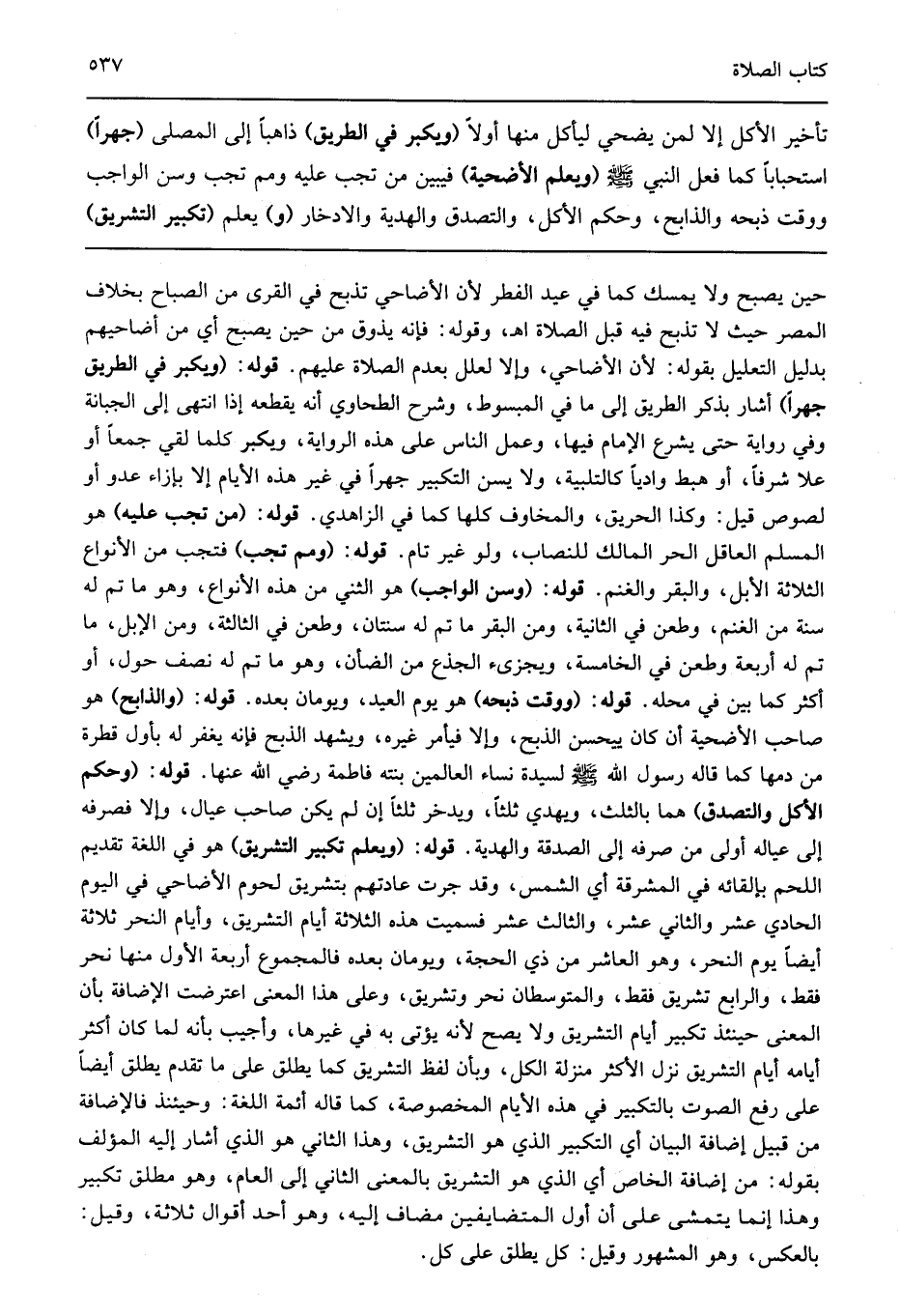 حين يصبح أي من أضاحيهم بدليل التعليل بقوله لأن الأضاحي وإلا لعلل بعدم الصلاة عليهم قوله: "ويكبر في الطريق جهرا" أشار بذكر الطريق إلى ما في المبسوط وشرح الطحاوي أنه يقطعه إذا انتهى إلى الجبانة وفي رواية حتى يشرع الإمام فيها وعمل الناس على هذه الرواية ويكبر كلما لقي جمعا أو علا شرفا أو هبط واديا كالتلبية ولا يسن التكبير جهرا في غير هذه الأيام إلا بإزاء عدو أو لصوص قيل وكذا الحريق والمخاوف كلها كما في الزاهدي قوله: "من تجب عليه" هو المسلم العاقل الحر المالك للنصاب ولو غير تام قوله: "ومم تجب" فتجب من الأنواع الثلاثة الإبل والبقر والغنم قوله: "وسن الواجب" هو الثني من هذه الأنواع وهو ما تم له سنة من الغنم وطعن في الثانية ومن البقر ما تم له سنتان وطعن في الثالثة ومن الإبل ما تم له أربعة وطعن في الخامسة ويجزىء الجذع من الضأن وهو ما تم له نصف حول أو أكثر كما بين في محله قوله: "ووقت ذبحه" هو يوم العيد ويومان بعده قوله: "والذابح" هو صاحب الأضحية أن كان ييحسن الذبح وإلا فيأمر غيره ويشهد الذبح فإنه يغفر له بأول قطرة من دمها كما قاله رسول الله صلى الله عليه وسلم لسيدة نساء العالمين بنته فاطمة رضي الله عنها قوله: "وحكم الأكل والتصدق" هما بالثلث ويهدي ثلثا ويدخر ثلثا إن لم يكن صاحب عيال وإلا فصرفه إلى عياله أولى من صرفه إلى الصدقة والهدية قوله: "ويعلم تكبير التشريق" هو في اللغة تقديم اللحم بإلقائه في المشرقة أي الشمس وقد جرت عادتهم بتشريق لحوم الأضاحي في اليوم الحادي عشر والثاني عشر والثالث عشر فسميت هذه الثلاثة أيام التشريق وأيام النحر ثلاثة أيضا يوم النحر وهو العاشر من ذي الحجة ويومان بعده فالمجموع أربعة الأول منها نحر فقط والرابع تشريق فقط والمتوسطان نحر وتشريق وعلى هذا المعنى اعترضت الإضافة بأن المعنى حينئذ تكبير أيام التشريق ولا يصح لأنه يؤتى به في غيرها وأجيب بأنه لما كان أكثر أيامه أيام التشريق نزل الأكثر منزلة الكل وبأن لفظ التشريق كما يطلق على ما تقدم يطلق أيضا على رفع الصوت بالتكبير في هذه الأيام المخصوصة كما قاله أئمة اللغة وحيئنذ فالإضافة من قبيل إضافة البيان أي التكبير الذي هو التشريق وهذا الثاني هو الذي أشار إليه المؤلف بقوله من إضافة الخاص أي الذي هو التشريق بالمعنى الثاني إلى العام وهو مطلق تكبير وهذا إنما يتمشى على أن أول المتضايفين مضاف إليه وهو أحد أقوال ثلاثة وقيل بالعكس وهو المشهور وقيل كل يطلق على كل