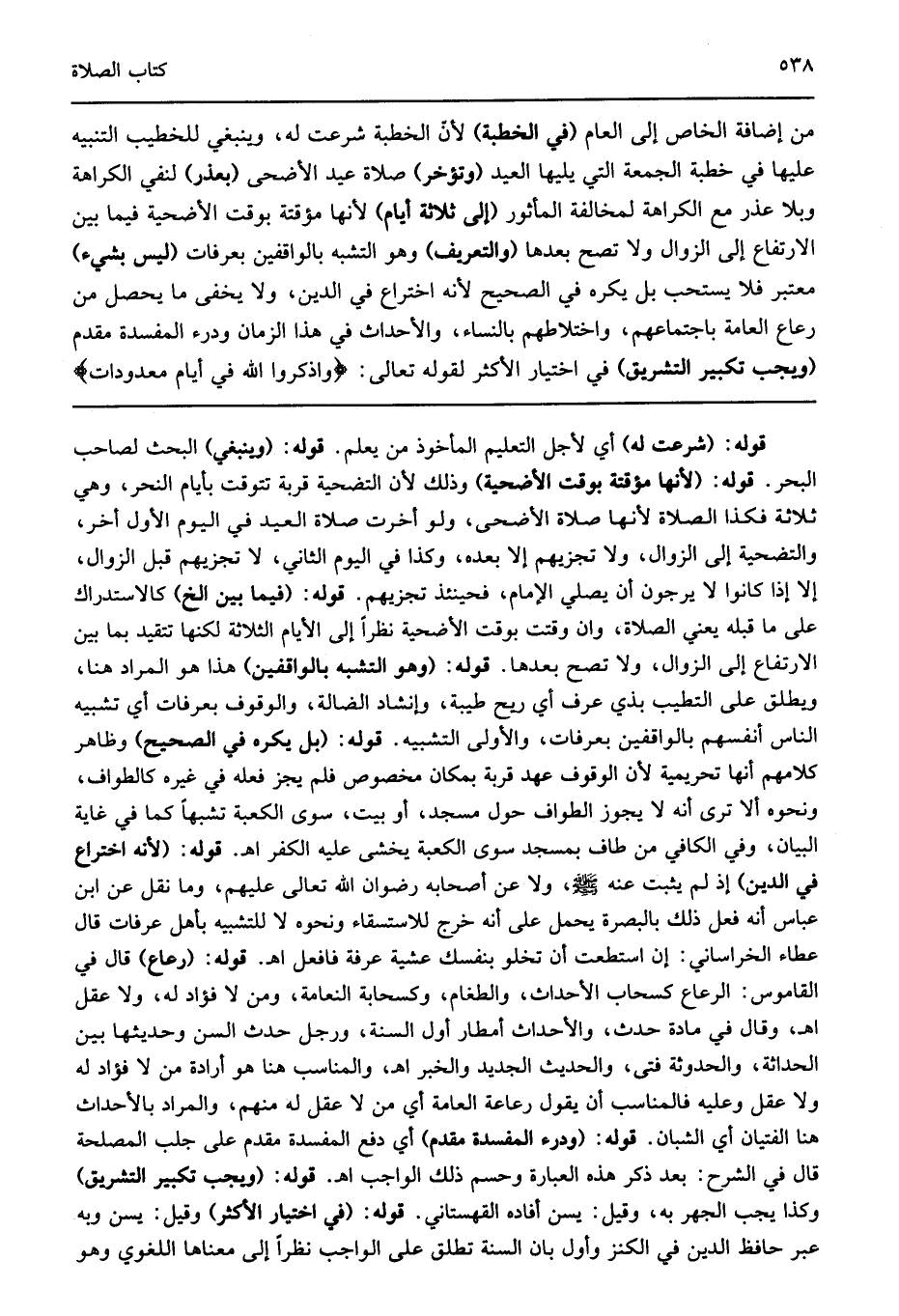 قوله: "شرعت له" أي لأجل التعليم المأخوذ من يعلم قوله: "وينبغي" البحث لصاحب البحر قوله: "لأنها مؤقتة بوقت الأضحية" وذلك لأن التضحية قربة تتوقت بأيام النحر وهي ثلاثة فكذا الصلاة لأنها صلاة الأضحى ولو أخرت صلاة العيد في اليوم الأول أخر والتضحية إلى الزوال ولا تجزيهم إلا بعده وكذا في اليوم الثاني لا تجزيهم قبل الزوال إلا إذا كانوا لا يرجون أن يصلي الإمام فحينئذ تجزيهم قوله: "فيما بين الخ" كالاستدراك على ما قبله يعني الصلاة وان وقتت بوقت الأضحية نظرا إلى الأيام الثلاثة لكنها تتقيد بما بين الارتفاع إلى الزوال ولا تصح بعدها قوله: "وهو التشبه بالواقفين" هذا هو المراد هنا ويطلق على التطيب بذي عرف أي ريح طيبة وإنشاد الضالة والوقوف بعرفات أي تشبيه الناس أنفسهم بالواقفين بعرفات والأولى التشبيه قوله: "بل يكره في الصحيح" وظاهر كلامهم أنها تحريمية لأن الوقوف عهد قربة بمكان مخصوص فلم يجز فعله في غيره كالطواف ونحوه ألا ترى أنه لا يجوز الطواف حول مسجد أو بيت سوى الكعبة تشبها كما في غاية البيان وفي الكافي من طاف بمسجد سوى الكعبة يخشى عليه الكفر اهـ قوله: "لأنه اختراع في الدين" إذ لم يثبت عنه صلى الله عليه وسلم ولا عن أصحابه رضوان الله تعالى عليهم وما نقل عن ابن عباس أنه فعل ذلك بالبصرة يحمل على أنه خرج للاستسقاء ونحوه لا للتشبيه بأهل عرفات قال عطاء الخراساني إن استطعت أن تخلو بنفسك عشية عرفة فافعل اهـ قوله: "رعاع" قال في القاموس الرعاع كسحاب الأحداث والطغام وكسحابة النعامة ومن لا فؤاد له ولا عقل اهـ وقال في مادة حدث والأحداث أمطار أول السنة ورجل حدث السن وحديثها بين الحداثة والحدوثة فتى والحديث الجديد والخبر اهـ والمناسب هنا هو أرادة من لا فؤاد له ولا عقل وعليه فالمناسب أن يقول رعاعة العامة أي من لا عقل له منهم والمراد بالأحداث هنا الفتيان أي الشبان قوله: "ودرء المفسدة مقدم" أي دفع المفسدة مقدم على جلب المصلحة قال في الشرح بعد ذكر هذه العبارة وحسم ذلك الواجب اهـ قوله: "ويجب تكبير التشريق" وكذا يجب الجهر به وقيل يسن أفاده القهستاني قوله: "في اختيار الأكثر" وقيل يسن وبه عبر حافظ الدين في الكنز وأول بان السنة تطلق على الواجب نظرا إلى معناها اللغوي وهو