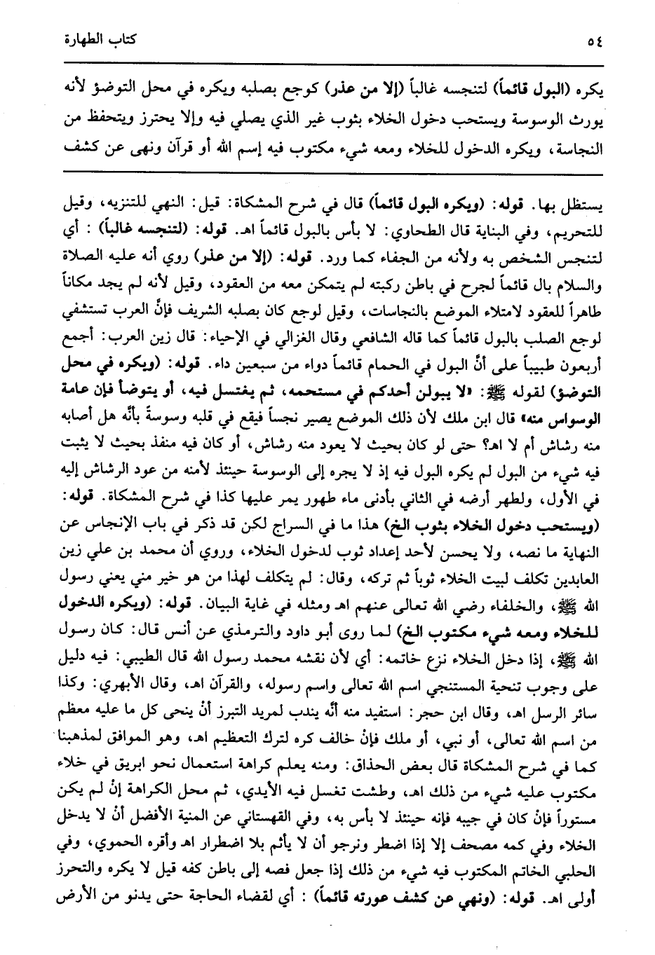 يكره "البول قائما" لتنجسه غالبا "إلا من عذر" كوجع بصلبه ويكره في محل التوضؤ لأنه يورث الوسوسة ويستحب دخول الخلاء بثوب غير الذي يصلي فيه وإلا يحترز ويتحفظ من النجاسة ويكره الدخول للخلاء ومعه شيء مكتوب فيه اسم الله أو قرآن ونهي عن كشف.