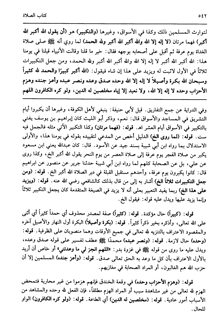 لتوارث المسلمين ذلك وكذا في الأسواق وغيرها "والتكبير" هو "أن يقول الله أكبر الله أكبر" مرتان "لا إله إلا الله والله أكبر ولله الحمد" لما روي أنه صلى الله عليه وسلم صلى صلاة الغداة يوم عرفة ثم أقبل على أصحابه بوجهه فقال: "خير ما قلنا وقالت الأنبياء قبلنا في يومنا هذا الله أكبر الله أكبر لا إله إلا الله والله أكبر ولله الحمد" ومن جعل التكبيرات ثلاثا في الأول لا تثبت له ويزيد على هذا إن شاء فيقول "الله أكبر كبيرا والحمد لله كثيرا وسبحان الله بكرة وأصيلا لا إله إلا الله وحده صدق وعده ونصر عبده وأعز جنده وهزم الأحزاب وحده لا إله إلا الله ولا نعبد إلا إياه مخلصين له الدين ولو كره الكافرون اللهم