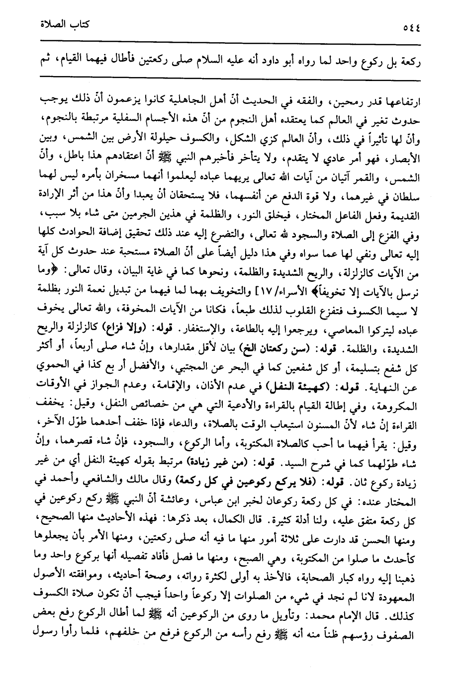 ارتفاعها قدر رمحين والفقه في الحديث أن أهل الجاهلية كانوا يزعمون أن ذلك يوجب حدوث تغير في العالم كما يعتقده أهل النجوم من أن هذه الأجسام السفلية مرتبطة بالنجوم وأن لها تأثيرا في ذلك وأن العالم كرى الشكل والكسوف حيلولة الأرض بين الشمس وبين الأبصار فهو أمر عادي لا يتقدم ولا يتأخر فأخبرهم النبي صلى الله عليه وسلم أن اعتقادهم هذا باطل وأن الشمس والقمر آيتان من آيات الله تعالى يريهما عباده ليعلموا أنهما مسخران بأمره ليس لهما سلطان في غيرهما ولا قوة الدفع عن أنفسهما فلا يستحقان أن يعبدا وأن هذا من أثر الإرادة القديمة وفعل الفاعل المختار فيخلق النور والظلمة في هذين الجرمين متى شاء بلا سبب وفي الفزع إلى الصلاة والسجود لله تعالى والتضرع إليه عند ذلك تحقيق إضافة الحوادث كلها إليه تعالى ونفي لها عما سواه وفي هذا دليل أيضا على أن الصلاة مستحبة عند حدوث كل آية من الآيات كالزلزلة والريح الشديدة والظلمة ونحوها كما في غاية البيان وقال تعالى: {وَمَا نُرْسِلُ بِالْآياتِ إِلَّا تَخْوِيفاً} [الأسراء 59] والتخويف بهما لما فيهما من تبديل نعمة النور بظلمة لا سيما الكسوف فتفزع القلوب لذلك طبعا فكانا من الآيات المخوفة والله تعالى يخوف عباده ليتركوا المعاصي ويرجعوا إليه بالطاعة والإستغفار قوله: "وإلا فزاع" كالزلزلة والريح الشديدة والظلمة قوله: "سن ركعتان الخ" بيان لأقل مقدارها وإن شاء صلى أربعا أو أكثر كل شفع بتسليمة أو كل شفعين كما في البحر عن المجتبي والأفضل أر بع كذا في الحموي عن النهاية قوله: "كهيئة النفل" في عدم الأذان والإقامة وعدم الجواز في الأوقات المكروهة وفي إطالة القيام بالقراءة والأدعية التي هي من خصائص النفل وقيل يخفف القراءة إن شاء لأن المسنون استيعاب الوقت بالصلاة والدعاء فإذا خفف أحدهما طول الآخر وقيل يقرأ فيهما ما أحب كالصلاة المكتوبة وأما الركوع والسجود فإن شاء قصرهما وإن شاء طولهما كما في شرح السيد قوله: "من غير زيادة" مرتبط بقوله كهيئة النفل أي من غير زيادة ركوع ثان قوله: "فلا يركع ركوعين في كل ركعة" وقال مالك والشافعي وأحمد في المختار عنده في كل ركعة ركوعان لخبر ابن عباس وعائشة أن النبي صلى الله عليه وسلم ركع ركوعين في كل ركعة متفق عليه ولنا أدلة كثيرة قال الكمال بعد ذكرها فهذه الأحاديث منها الصحيح ومنها الحسن قد دارت على ثلاثة أمور منها ما فيه أنه صلى ركعتين ومنها الأمر بأن يجعلوها كأحدث ما صلوا من المكتوبة وهي الصبح ومنها ما فصل فأفاد تفصيله أنها بركوع واحد وما ذهبنا إليه رواه كبار الصحابة فالأخذ به أولى لكثرة رواته وصحة أحاديثه وموافقته الأصول المعهودة لأنا لم نجد في شيء من الصلوات إلا ركوعا واحدا فيجب أن تكون صلاة الكسوف كذلك قال الإمام محمد وتأويل ما روى من الركوعين أنه صلى الله عليه وسلم لما أطال الركوع رفع بعض الصفوف رؤسهم ظنا منه أنه صلى الله عليه وسلم رفع رأسه من الركوع فرفع من خلفهم فلما رأوا رسول