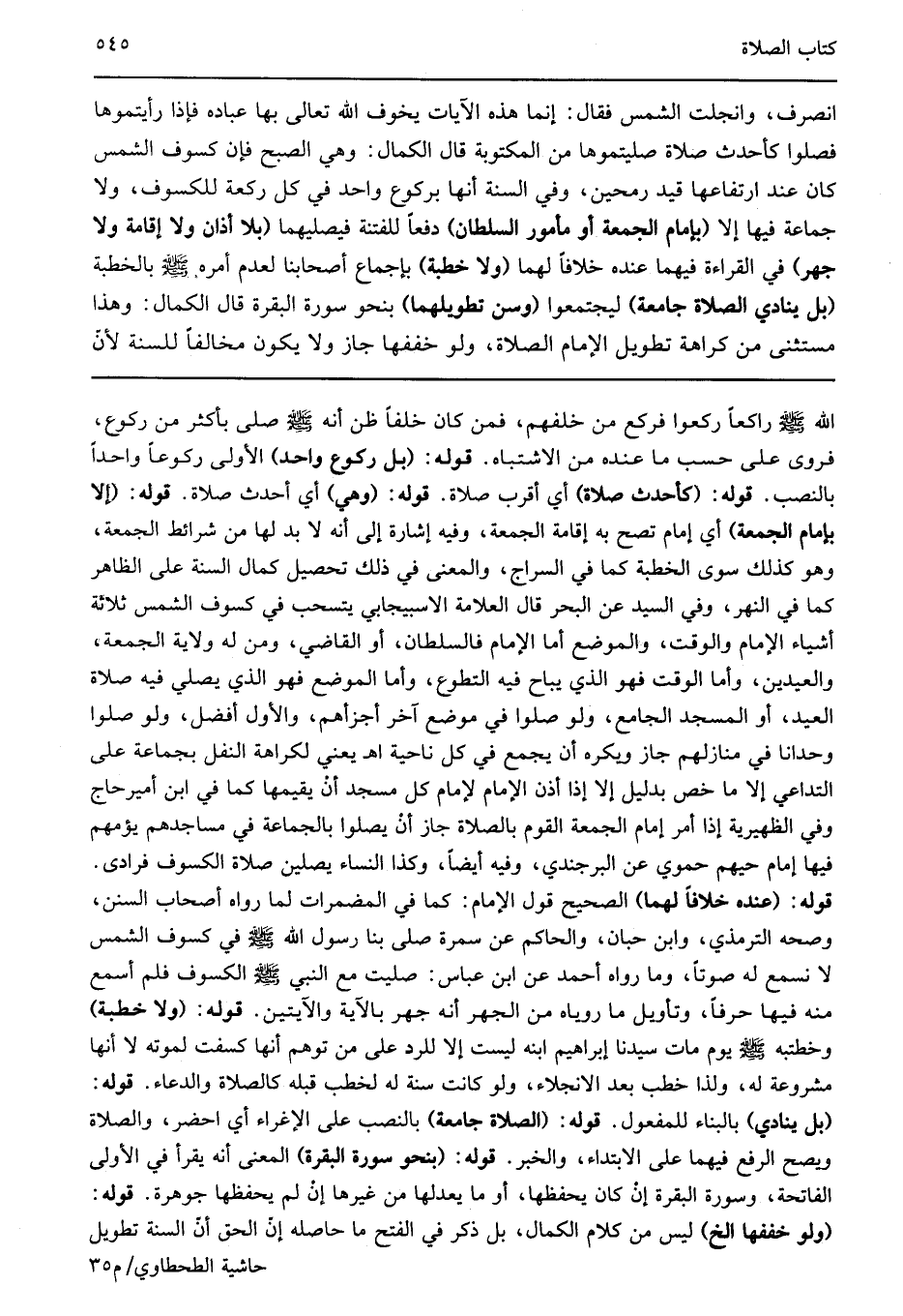 الله صلى الله عليه وسلم راكعا ركعوا فركع من خلفهم فمن كان خلفا ظن أنه صلى الله عليه وسلم صلى بأكثر من ركوع فروى على حسب ما عنده من الاشتباه قوله: "بل ركوع واحد" الأولى ركوعا واحدا بالنصب قوله: "كأحدث صلاة" أي أقرب صلاة قوله: "وهي" أي أحدث صلاة قوله: "إلا بإمام الجمعة" أي إمام تصح به إقامة الجمعة وفيه إشارة إلى أنه لا بد لها من شرائط الجمعة وهو كذلك سوى الخطبة كما في السراج والمعنى في ذلك تحصيل كمال السنة على الظاهر كما في النهر وفي السيد عن البحر قال العلامة الاسبيجابي يتسحب في كسوف الشمس ثلاثة أشياء الإمام والوقت والموضع أما الإمام فالسلطان أو القاضي ومن له ولاية الجمعة والعيدين وأما الوقت فهو الذي يباح فيه التطوع وأما الموضع فهو الذي يصلي فيه صلاة العيد أو المسجد الجامع ولو صلوا في موضع آخر أجزأهم والأول أفضل ولو صلوا وحدانا في منازلهم جاز ويكره أن يجمع في كل ناحية اهـ يعني لكراهة النفل بجماعة على التداعي إلا ما خص بدليل إلا إذا أذن الإمام لإمام كل مسجد أن يقيمها كما في ابن أميرحاج وفي الظهيرية إذا أمر إمام الجمعة القوم بالصلاة جاز أن يصلوا بالجماعة في مساجدهم يؤمهم فيها إمام حيهم حموي عن البرجندي وفيه أيضا وكذا النساء يصلين صلاة الكسوف فرادى قوله: "عنده خلافا لهما الصحيح قول الإمام كما في المضمرات لما رواه أصحاب السنن وصحه الترمذي وابن حبان والحاكم عن سمرة صلى بنا رسول الله صلى الله عليه وسلم في كسوف الشمس لا نسمع له صوتا وما رواه أحمد عن ابن عباس صليت مع النبي صلى الله عليه وسلم الكسوف فلم أسمع منه فيها حرفا وتأويل ما روياه من الجهر أنه جهر بالآية والآيتين قوله: "ولا خطبة" وخطبته صلى الله عليه وسلم يوم مات سيدنا إبراهيم ابنه ليست إلا للرد على من توهم أنها كسفت لموته لا أنها مشروعة له ولذا خطب بعد الانجلاء ولو كانت سنة له لخطب قبله كالصلاة والدعاء قوله: "بل ينادي" بالبناء للمفعول قوله: "الصلاة جامعة" بالنصب على الإغراء أي احضر والصلاة ويصح الرفع فيهما على الابتداء والخبر قوله: "بنحو سورة البقرة" المعنى أنه يقرأ في الأولى الفاتحة وسورة البقرة إن كان يحفظها أو ما يعدلها من غيرها إن لم يحفظها جوهرة قوله: "ولو خففها الخ" ليس من كلام الكمال بل ذكر في الفتح ما حاصله إن الحق أن السنة تطويل