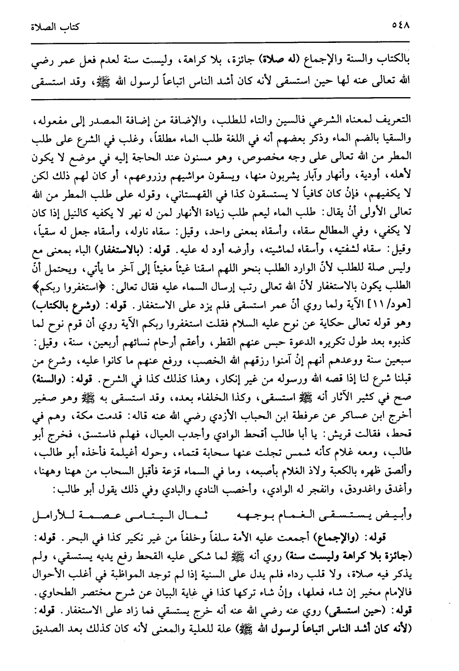 قوله: "والإجماع" أجمعت عليه الأمة سلفا وخلفا من غير نكير كذا في البحر قوله: "جائزة بلا كراهة وليست سنة" روي أنه صلى الله عليه وسلم لما شكى عليه القحط رفع يديه يستسقي ولم يذكر فيه صلاة ولا قلب رداء فلم يدل على السنية إذا لم توجد المواظبة في أغلب الأحوال فالإمام مخير إن شاء فعلها وإن شاء تركها كذا في غاية البيان عن شرح مختصر الطحاوي قوله: "حين استسقى" روي عنه رضي الله عنه أنه خرج يستسقي فما زاد على الاستغفار قوله: "لأنه كان أشد الناس اتباعا لرسول الله صلى الله عليه وسلم" علة للعلية والمعنى لأنه كان كذلك بعد الصديق