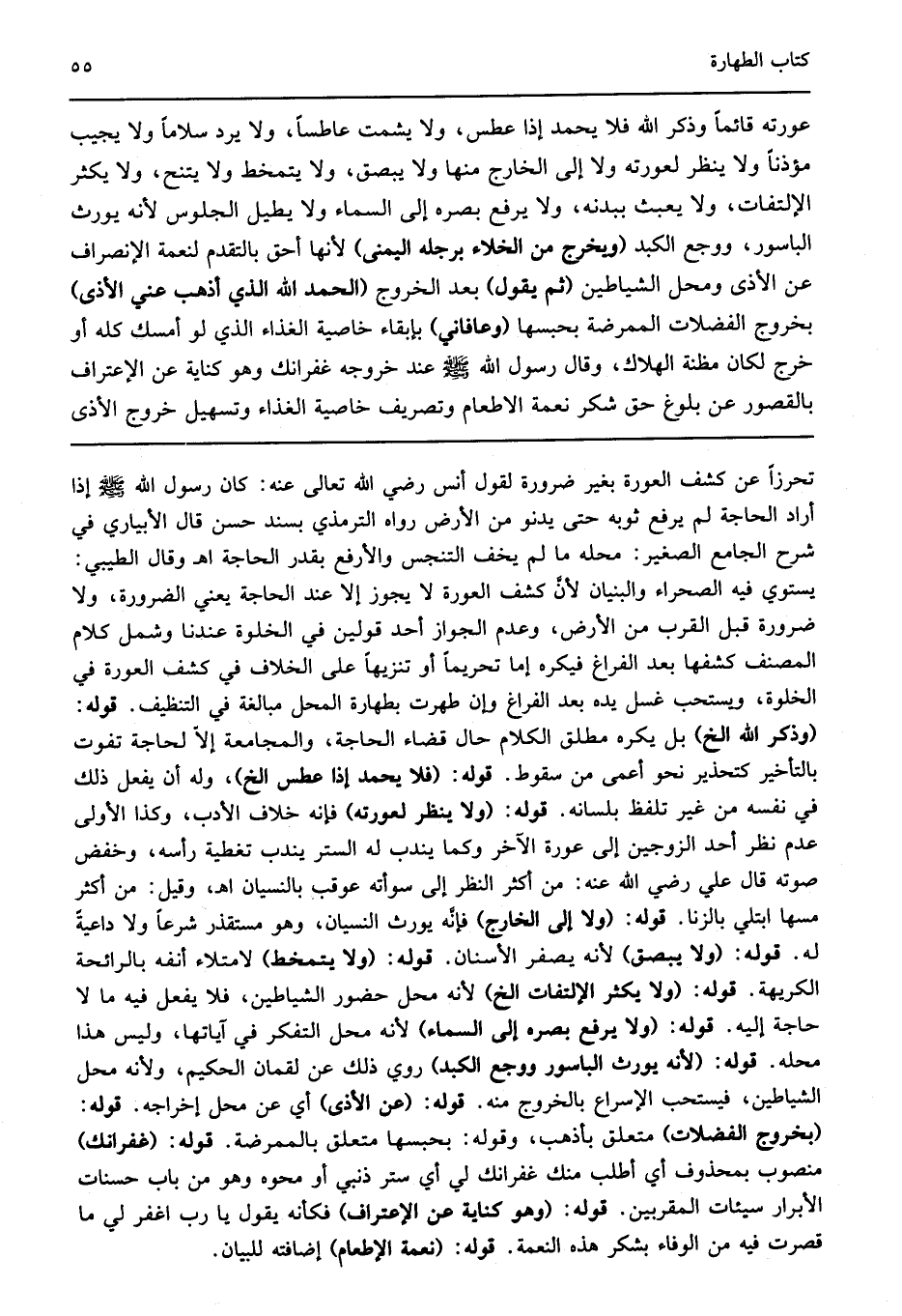 تحرزا عن كشف العورة بغير ضرورة لقول أنس رضي الله تعالى عنه كان رسول الله صلى الله عليه وسلم إذا أراد الحاجة لم يرفع ثوبه حتى يدنو من الأرض رواه الترمذي بسند حسن قال الأبياري في شرح الجامع الصغير محله ما لم يخف التنجس والأرفع بقدر الحاجة اهـ وقال الطيبي يستوي فيه الصحراء والبنيان لأن كشف العورة لا يجوز إلا عند الحاجة يعني الضرورة ولا ضرورة قبل القرب من الأرض وعدم الجواز أحد قولين في الخلوة عندنا وشمل كلام المصنف كشفها بعد الفراغ فيكره إما تحريما أو تنزيها على الخلاف في كشف العورة في الخلوة ويستحب غسل يده بعد الفراغ وإن طهرت بطهارة المحل مبالغة في التنظيف قوله: "وذكر الله الخ" بل يكره مطلق الكلام حال قضاء الحاجة والمجامعة إلا لحاجة تفوت بالتأخير كتحذير نحو أعمى من سقوط قوله: "فلا يحمد إذا عطس الخ" وله أن يفعل ذلك في نفسه من غير تلفظ بلسانه قوله: "ولا ينظر لعورته" فإنه خلاف الأدب وكذا الأولى عدم نظر أحد الزوجين إلى عورة الآخر وكما يندب له الستر يندب تغطية رأسه وخفض صوته قال علي رضي الله عنه من أكثر النظر إلى سوأته عوقب بالنسيان اهـ وقيل من أكثر مسها ابتلي بالزنا قوله: "ولا إلى الخارج" فإنه يورث النسيان وهو مستقذر شرعا ولا داعية له قوله: "ولا يبصق" لأنه يصفر الأسنان قوله: "ولا يتمخط" لامتلاء أنفه بالرائحة الكريهة قوله: "ولا يكثر الإلتفات الخ" لأنه محل حضور الشياطين فلا يفعل فيه ما لا حاجة إليه قوله: "ولا يرفع بصره إلى السماء" لأنه محل التفكر في آياتها وليس هذا محله قوله: "لأنه يورث الباسور ووجع الكبد" روي ذلك عن لقمان الحكيم ولأنه محل الشياطين فيستحب الإسراع بالخروج منه قوله: "عن الأذى" أي عن محل إخراجه قوله: "بخروج الفضلات" متعلق بأذهب وقوله بحبسها متعلق بالممرضة قوله: "غفرانك" منصوب بمحذوف أي أطلب منك غفرانك لي أي ستر ذنبي أو محوه وهو من باب حسنات الأبرار سيئات المقربين قوله: "وهو كناية عن الإعتراف" فكأنه يقول يا رب اغفر لي ما قصرت فيه من الوفاء بشكر هذه النعمة قوله: "نعمة الإطعام" إضافته للبيان.