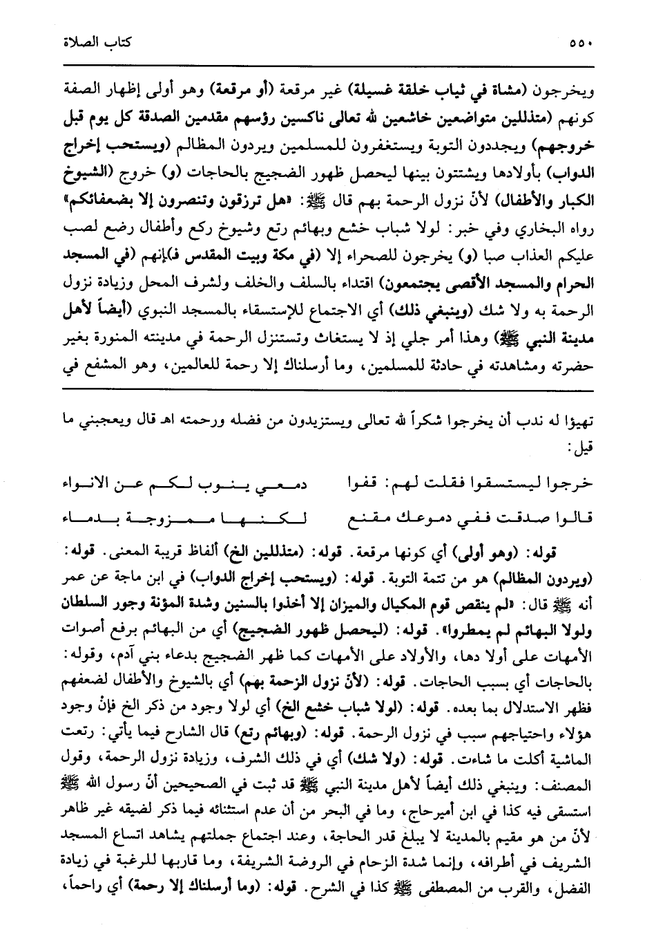 قوله: "وهو أولى" أي كونها مرقعة قوله: "متذللين الخ" ألفاظ قريبة المعنى قوله: "ويردون المظالم" هو من تتمة التوبة قوله: "ويستحب إخراج الدواب" في ابن ماجة عن عمر أنه صلى الله عليه وسلم قال: "لم ينقص قوم المكيال والميزان إلا أخذوا بالسنين وشدة المؤنة وجور السلطان ولولا البهائم لم يمطروا" قوله: "ليحصل ظهور الضجيج" أي من البهائم برفع أصوات الأمهات على أولا دها والأولاد على الأمهات كما ظهر الضجيج بدعاء بني آدم وقوله بالحاجات أي بسبب الحاجات قوله: "لأن نزول الزحمة بهم" أي بالشيوخ والأطفال لضعفهم فظهر الاستدلال بما بعده قوله: "لولا شباب خشع الخ" أي لولا وجود من ذكر الخ فإن وجود هؤلاء واحتياجهم سبب في نزول الرحمة قوله: "وبهائم رتع" قال الشارح فيما يأتي رتعت الماشية أكلت ما شاءت قوله: "ولا شك" أي في ذلك الشرف وزيادة نزول الرحمة وقول المصنف وينبغي ذلك أيضا لأهل مدينة النبي صلى الله عليه وسلم قد ثبت في الصحيحين أن رسول الله صلى الله عليه وسلم استسقى فيه كذا في ابن أميرحاج وما في البحر من أن عدم استثنائه فيما ذكر لضيقه غير ظاهر لأن من هو مقيم بالمدينة لا يبلغ قدر الحاجة وعند اجتماع جملتهم يشاهد اتساع المسجد الشريف في أطرافه وإنما شدة الزحام في الروضة الشريفة وما قاربها للرغبة في زيادة الفضل والقرب من المصطفى صلى الله عليه وسلم كذا في الشرح قوله: "وما أرسلناك إلا رحمة" أي راحما