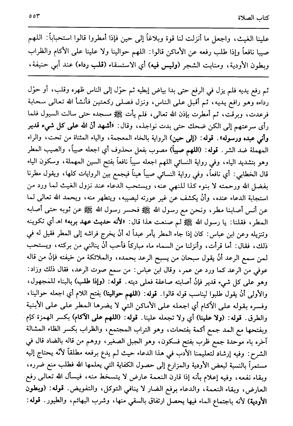 ثم رفع يديه فلم يزل في الرفع حتى بدا بياض إبطيه ثم حول إلى الناس ظهره وقلب أو حول رداءه وهو رافع يديه ثم أقبل على الناس ونزل فصلى ركعتين فأنشأ الله تعالى سحابة فرعدت وبرقت ثم أمطرت بإذن الله تعالى فلم يأت صلى الله عليه وسلم مسجده حتى سالت السيول فلما رأى سرعتهم إلى الكن ضحك حتى بدت نواجذه وقال أشهد أن الله على كل شيء قدير وأني عبده ورسوله قوله: "إلى حين" الرواية بالخاء المعجمة والياء المثناة من تحت والراء المهملة ضد الشر قوله: "اللهم صيبا" مصوب بفعل محذوف أي اجعله صيبا والصيب المطر وهو بتشديد الياء وفي رواية النسائي اللهم اجعله سيبا نافعا بفتح السين المهملة وسكون الياء قال الخطابي أي نافعا وفي رواية النسائي صيبا هينا فيجمع بين الروايات كلها ويقول مطرنا بفضل الله ورحمته لا بنوء كذا للنهي عنه ويستحب الدعاء عند نزول الغيث لما ورد من استجابة الدعاء عنده وأن يكشف عن غير عورته ليصيبه ويتطهر منه ويحمد الله تعالى لما عن أنس أصابنا مطر ونحن مع رسول الله صلى الله عليه وسلم فحسر رسول الله صلى الله عليه وسلم عن ثوبه حتى أصابه المطر فقلنا يا رسول الله صلى الله عليه وسلم لم صنعت هذا قال لأنه حديث عهد بربه اهـ أي تكوينه وتنزيله وعن ابن عباس كان إذا جاء المطر يأمر عبدا له أن يخرج فراشه إلى المطر فقيل له في ذلك فقال: أما قرأت وأنزلنا من السماء ماء مباركا فأحب أن ينالني من بركته ويستحب لمن سمع الرعد أن يقول سبحان من يسبح الرعد بحمده والملائكة من خيفته فإن من قاله عوفي من الرعد كما ورد عن عمر وقال ابن عباس من سمع صوت الرعد فقال ذلك وزاد وهو على كل شيء قدير فإن أصابته صاعقة فعلى ديته قوله: "وإذا طلب" بالبناء للمجهول والأولى أن يقول طلبوا ليناسب قوله قالوا: قوله: "اللهم حوالينا" بفتح اللام أي اجعله حوالينا وفسره بقوله على الآكام أي اجعله على الأماكن التي لا يضرها المطر على على الأبنية والطرق قوله: "ولا علينا" أي ولا تجعله علينا قوله: "اللهم على الآكام" بكسر الهمزة كإم وبفتحها مع المد جمع أكمة بفتحات وهو التراب المجتمع والظراب بكسر الظاء المشالة آخره باء موحدة جمع ظرب بفتح فسكون وهو الجبل الصغير ووهم من قاله بالضاد قال في الشرح وفيه إرشاد لتعليمنا الأدب في هذا الدعاء حيث لم يدع برفعه مطلقا لأنه يحتاج إليه مستمرا بالنسبة لبعض الأودية والمزارع إلى حصول الكفاية التي يعلمها الله فطلب منع ضرره وبقاء نفعه وفيه إعلام بأنه إذا قارن النعمة عارض لا يتسخط منه فيسأل الله تعالى رفع العارض وبقاء النعمة والدعاء برفع الضار لا ينافي التوكل والتفويض قوله: "وبطون الأودية" لأنه باجتماع الماء فيها يحصل ارتفاق بالسقي منها وشرب البهائم والطيور قوله: