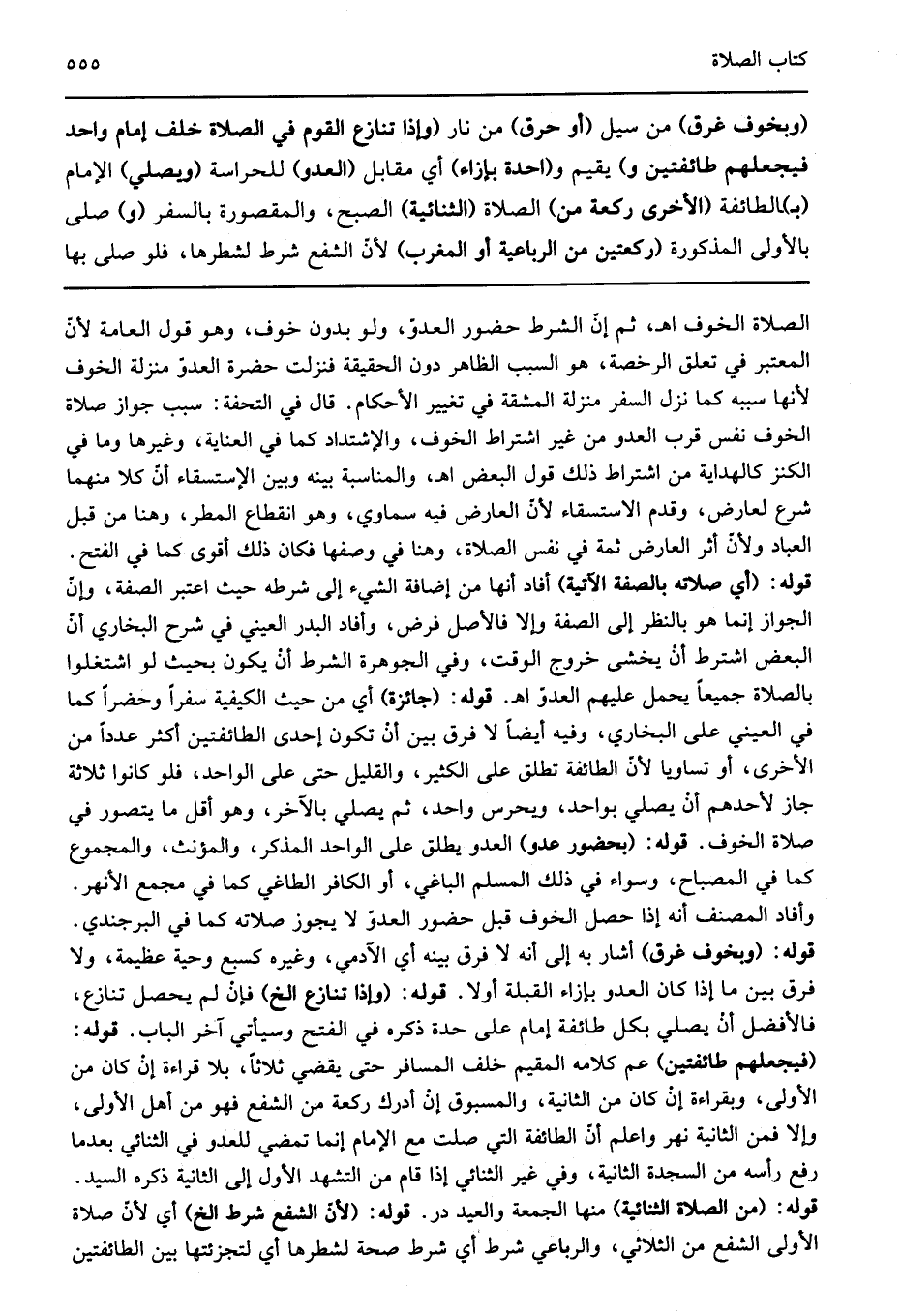 "وبخوف غرق" من سيل "أو حرق" من نار "وإذا تنازع القوم في الصلاة خلف إمام واحد فيجعلهم طائفتين" ويقيم "واحدة بإزاء" أي مقابل "العدو" للحراسة "ويصلي" الإمام "ب" الطائفة "الأخرى ركعة من" الصلاة "الثنائية" الصبح والمقصورة بالسفر "و" يصلي بالأولى المذكورة "ركعتين من الرباعية أو المغرب" لأن الشفع شرط لشرطها فلو صلى بها