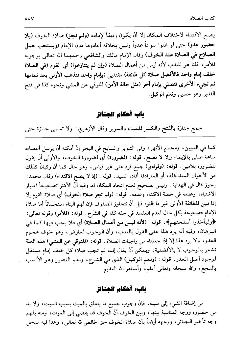 كما في التبيين ومجمع الأنهر وفي التنوير والسابح في البحر إن أمكنه أن يرسل أعضاءه ساعة صلى بالإيماء وإلا لا تصح قوله: "لضرورة" أي لضرورة الخوف والأولى أن يقول للضرورة بلامين قوله: "وفرادى" جمع فرد على غير قياس وهو حال كما أن ركبانا كذلك من الأحوال المتداخلة أو المترادفة أفاده السيد قوله: "إذ لا يصح الاقتداء" وقال محمد يجوز قال في الهداية وليس بصحيح لعدم اتحاد المكان اهـ وفيه أن الأكثر تصحيحا اعتبار الاشتباه وعدمه في حصة الاقتداء وعدمه الأولى غير ما ظنوه قبل أن تتجاوز الصفوف فإن لهم البناء استحسانا أما صلاة الإمام فصحيحة بكل حال لعدم المفسد في حقه كذا في الشرح قوله: "للأمر" وقوله تعالى: {وَلْيَأْخُذُوا أَسْلِحَتَهُمْ} قوله: "ولم تجز صلاة الخوف" أي صلاة القوم إلا إذا تبين للطائفة قوله: "لأنه ليس من أعمال الصلاة" أي فلا يجب فيها كما في البرهان وفيه أنه يرد هذا على القول بالندب وأن الوجوب لعارض وهو خوف هجوم العدو ولا يرد هذا إلا إذا جعلناه من واجبات الصلاة قوله: "للتوقي عن المشي" هذه العلة تشعر بالوجوب لا بالأفضلية ويمكن أن يقال إنما لم تجب صلاة كل خلف إمام مستقل لوجود أصل العذر قوله: "ونعم الوكيل" الذي في الشرح ونعم النصير وهو الأنسب بالسجع والله سبحانه وتعالى أعلم وأستغفر الله العظيم.