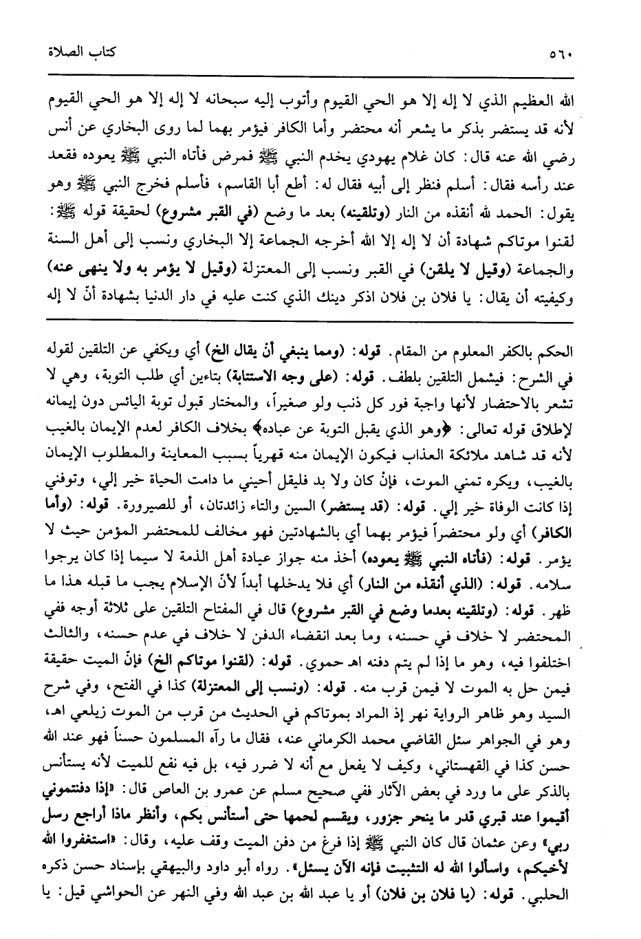 الله العظيم الذي لا إله إلا هو الحي القيوم وأتوب إليه سبحانه لا إله إلا هو الحي القيوم لأنه قد يستضر بذكر ما يشعر أنه محتضر وأما الكافر فيؤمر بهما لما روى البخاري عن أيس؟؟ رضي الله عنه قال كان غلام يهودي يخدم النبي صلى الله عليه وسلم فمرض فأتاه النبي صلى الله عليه وسلم يعوده فقعد عند رأسه فقال: "أسلم" فنظر إلى أبيه فقال له: أطع أبا القاسم فأسلم فخرج النبي صلى الله عليه وسلم وهو يقول "الحمد لله الذي أنقذه من النار" "وتلقينه" بعد ما وضع "في القبر مشروع" لحقيقة قوله صلى الله عليه وسلم: "لقنوا موتاكم شهادة أن لا إله إلا الله" أخرجه الجماعة إلا البخاري ونسب إلى أهل السنة والجماعة "وقيل لا يلقن" في القبر ونسب إلى المعتزلة "وقيل لا يؤمر به ولا ينهى عنه" وكيفيته أن يقال: يا فلان أين فلان أذكر دينك الذي كنت عليه في دار الدنيا بشهادة أن لا إله