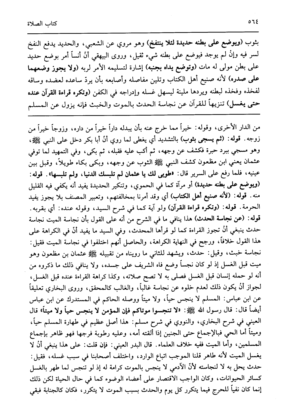 من الدار الأخرى وقوله خيرا مما خرج عنه بأن يبدله دارا خيرا من داره وزوجا خيرا من زوجه قوله: "ثم يسجى بثوب" بالتشديد أي يغطى لما روي أن أبا بكر دخل على النبي صلى الله عليه وسلم وهو مسجي ببرد حبرة فكشف عن وجهه ثم أكب عليه فقبله ثم بكى وفي التمهيد لما توفي عثمان يعني ابن مظعون كشف النبي صلى الله عليه وسلم الثوب عن وجهه وبكى بكاء طويلا وقبل بين عينيه فلما رفع على السرير قال: "طوبى لك يا عثمان لم تلبسك الدنيا ولم تلبسها" قوله: "ويوضع على بطنه حديدة" أو مرآة كما في الحموي وتنكير الحديدة يفيد أنه يكفي فيه القليل منه قوله: "لأنه صنيع أهل الكتاب" أي وقد أمرنا بمخالفتهم وتعبير المصنف بلا يجوز يفيد الحرمة قوله: "وتكره قراءة القرآن" ولو آية كما في شرح السيد وقوله عنده أي بقربه قوله: "عن نجاسة الحدث" هذا ينافي ما في الشرح من أنه على القول بأن نجاسة الميت نجاسة حدث ينبغي أن تجوز القراءة كما لو قرأها المحدث وفي السيد ما يفيد أن في الكراهة على هذا القول خلافا ورجح في النهاية الكراهة والحاصل أنهم اختلفوا في نجاسة الميت فقيل نجاسة خبث وقيل حدث ويشهد للثاني ما رويناه من تقبيله صلى الله عليه وسلم عثمان بن مظعون وهو ميت قبل الغسل إذ لو كان نجسا وضع فاه الشريف على جسده ولا ينافي ذلك ما ذكروه من أنه لو حمله إنسان قبل الغسل فصلى به لا تصح صلاته وكذا كراهة القراءة عنده قبل الغسل لجواز أن يكون ذلك لعدم خلوه عن نجاسة غالبا والغالب كالمحقق وروى البخاري تعليقا عن ابن عباس "المسلم لا ينجس حيا ولا ميتا" ووصله الحاكم في المستدرك عن ابن عباس أيضا قال قال رسول الله صلى الله عليه وسلم: "لا تنجسوا موتاكم فإن المؤمن لا ينجس حيا ولا ميتا" قال العيني في شرح البخاري والنووي في شرح مسلم هذا أصل عظيم في طهارة المسلم حيا وميتا أما الحي فبالإجماع حتى الجنين إذا ألقته أمه وعليه رطوبة فرجها فهو ظاهر بإجماع المسلمين وأما الميت ففيه خلاف العلماء قال البدر العيني فإن قلت على هذا ينبغي أن لا يغسل الميت لأنه طاهر قلنا الموجب اتباع الوارد واختلف أصحابنا في سبب غسله فقيل حدث يحل به لا لنجاسته لأن الآدمي لا ينجس بالموت كرامة له إذ لو تنجس لما طهر بالغسل كسائر الحيوانات وكان الواجب الاقتصار على أعضاء الوضوء كما في حال الحياة لكن ذلك إنما كان نفيا للحرج فيما يتكرر كل يوم والحدث بسبب الموت لا يتكرر فكان كالجنابة فبقي