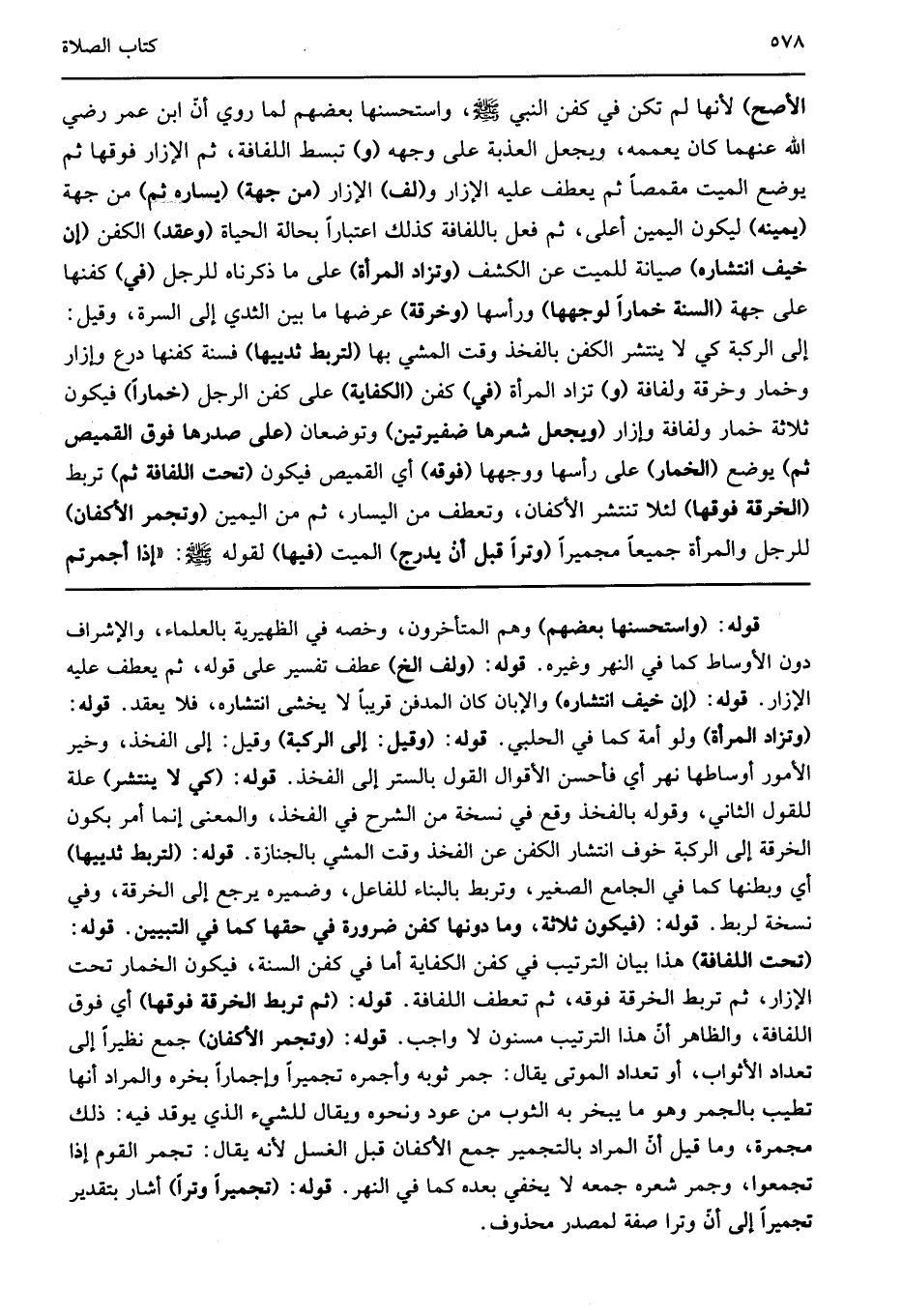 قوله: "واستحسنها بعضهم" وهم المتأخرون وخصه في الظهيرية بالعلماء والإشراف دون الأوساط كما في النهر وغيره قوله: "ولف الخ" عطف تفسير على قوله ثم يعطف عليه الإزار قوله: "إن خيف انتشاره" والإبان كان المدفن قريبا لا يخشى انتشاره فلا يعقد قوله: "وتزاد المرأة" ولو أمة كما في الحلبي قوله: "وقيل إلى الركبة" وقيل إلى الفخذ وخير الأمور أوساطها نهر أي فأحسن الأقوال القول بالستر إلى الفخذ قوله: "كي لا ينتشر" علة للقول الثاني وقوله بالفخذ وقع في نسخة من الشرح في الفخذ والمعنى إنما أمر بكون الخرقة إلى الركبة خوف انتشار الكفن عن الفخذ وقت المشي بالجنازة قوله: "لتربط ثدييها" أي وبطنها كما في الجامع الصغير وتربط بالبناء للفاعل وضميره يرجع إلى الخرقة وفي نسخة لربط قوله: "فيكون ثلاثة وما دونها كفن ضرورة في حقها كما في التبيين قوله: "تحت اللفافة" هذا بيان الترتيب في كفن الكفاية أما في كفن السنة فيكون الخمار تحت الإزار ثم تربط الخرقة فوقه ثم تعطف اللفافة قوله: "ثم تربط الخرقة فوقها" أي فوق اللفافة والظاهر أن هذا الترتيب مسنون لا واجب قوله: "وتجمر الأكفان" جمع نظيرا إلى تعداد الأثواب أو تعداد الموتى يقال جمر ثوبه وأجمره تجميرا وإجمارا بخره والمراد أنها تطيب بالجمر وهو ما يبخر به الثوب من عود ونحوه ويقال للشيء الذي يوقد فيه ذلك مجمرة وما قيل أن المراد بالتجمير جمع الأكفان قبل الغسل لأنه يقال تجمر القوم إذا تجمعوا وجمر شعره جمعه لا يخفي بعده كما في النهر قوله: "تجميرا وترا" أشار بتقدير تجميرا إلى أن وترا صفة لمصدر محذوف