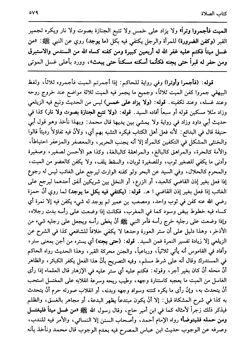 قوله: "فأجمرا وأوترا" وفي رواية للحاكم إذا أجمرتم الميت فأجمروه ثلاثا ولفظ البيهقي جمروا كفن الميت ثلاثا وجميع ما يجمر فيه الميت ثلاثة مواضع عند خروج روحه وعند غسله وعند تكفينه قوله: "ولا يزاد على خمس" ليس من الحديث وتبع فيه الزيلعي وزاد منلا مسكين قوله أو سبعا أفاده السيد قوله: "ولا تتبع الجنازة بصوت ولا نار" كذا في حديث أبي داود وزاد في رواية ولا يمشي بين يديها قال محمد وبهذا نأخذ وهو قول أبي حنيفة قال في البدائع لأنه فعل أهل الكتاب فيكره التشبه بهم أي ولأن فيه تفاؤلا رديئا قالوا: والخنثى المشكل في التكفين كالمرأة إلا أنه يجنب الحرير والمعصفر والمزعفر احتياطا والأمة كالحرة والمراهق كالبالغ والمراهقة كالبالغة وكذا هو الأحسن لصغير وصغيرة وأدنى ما يكفي للصغير ثوب وللصغيرة ثوبان والسقط يلف ولا يكفن كالعضو من الميت والمحرم كالحلال وفي السيد عن البحر ولو كفنه الوارث ليرجع على الغائب ليس له رجوع إذا فعل بغير إذن القاضي كالعبد أو الزرع أو النخل بين شريكين أنفق أحدهما ليرجع على الغائب إذا فعل بغير إذن القاضي اهـ قوله: "يكتفي فيه بكل ما يوجد" لما روى أن حمزة رضي الله عنه كفن في ثوب واحد ومصعب بن عمير لم يوجد له شيء يكفن فيه إلا نمرة أي كساء فيه خطوط بيض وسود كما في المغرب فكانت إذا وضعت على رأسه بدت رجلاه وإذا وضعت على رجليه خرج رأسه فأمر النبي صلى الله عليه وسلم أن يغطي رأسه ويجعل على رجليه شيء من الأذخر وهذا دليل على أن ستر العورة وحدها لا يكفي خلافا للشافعي كذا في الشرح عن الزيلعي إلا زيادة تفسير النمرة فمن السيد قوله: "حتى يجنه" أي يستره من أجن بمعنى ستر وأفاد في القاموس أنه يأتي ثلاثيا ورباعيا والجنن محركة القبر وهذا الحديث رواه الحاكم في المستدرك وقال أنه على شرط مسلم وفيه التصريح بأن هذا الفعل يكفر الكبائر والظاهر أن محله أن كان بغير أجر وقوله فكتم عليه أي ستر عليه في الإزهار قال العلماء إذا رأى الغاسل من الميت ما يعجبه كاستنارة وجهه وطيب ريحه وسرعة انقلابه على المغتسل استحب أن يتحدث به وإن رأى ما يكره كنتنه وسواد وجهه وبدنه أو انقلاب صورته حرم أن يتحدث به كذا في شرح المشكاة قيل إلا أن يكون مبتدعا يظهر البدعة أو مجاهر بالغسق والظلم فيذكر ذلك زجرا لأمثاله كما في ابن أمير حاج وقال رسول الله صلى الله عليه وسلم "من غسل ميتا فليغتسل ومن حمله فليتوضأ" رواه الإمام أحمد وأصحاب السنن إلا النسائي والأمر فيه للندب وصرفه عن الوجوب حديث ابن عباس المصرح فيه بعدم الوجوب قال محمد ونأخذ بأنه