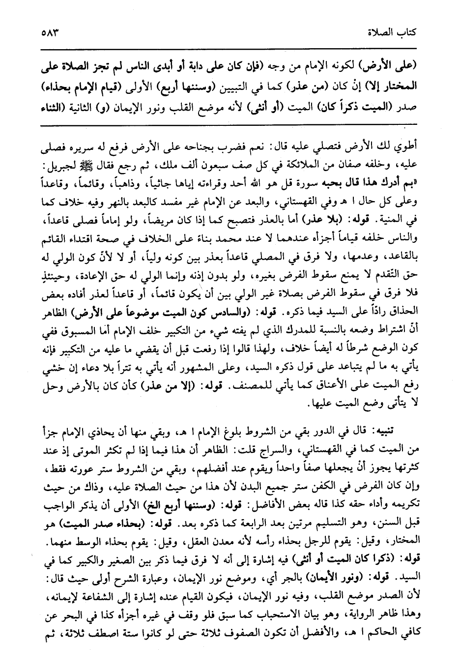 تنبيه: قال في الدوربقي من الشروط بلوغ الإمام اهـ وبقي منها أن يحاذي الإمام جزأ من الميت كما في القهستاني والسراج قلت الظاهر أن هذا فيما إذا لم تكثر الموتى إذ عند كثرتها يجوز أن يجعلها صفا واحدا ويقوم عند أفضلهم وبقي من الشروط ستر عورته فقط وإن كان الفرض في الكفن ستر جميع البدن لأن هذا من حيث الصلاة عليه وذاك من حيث تكريمه وأداء حقه كذا قاله بعض الأفاضل قوله: "وسننها أربع الخ" الأولى أن يذكر الواجب قبل السنن وهو التسليم مرتين بعد الرابعة كما ذكره بعد قوله: "بحذاء صدر الميت" هو المختار وقيل يقوم للرجل بحذاء رأسه لأنه معدن العقل وقيل يقوم بحذاء الوسط منهما قوله: "ذكرا كان الميت أو أنثى" فيه إشارة إلى أنه لا فرق فيما ذكر بين الصغير والكبير كما في السيد قوله: "ونور الأيمان" بالجر أي وموضع نور الإيمان وعبارة الشرح أولى حيث قال لأن الصدر موضع القلب وفيه نور الإيمان فيكون القيام عنده إشارة إلى الشفاعة لإيمانه وهذا ظاهر الرواية وهو بيان الاستحباب كما سبق فلو وقف في غيره أجزأه كذا في البحر عن كافي الحاكم اهـ والأفضل أن تكون الصفوف ثلاثة حتى لو كانوا ستة اصطف ثلاثة ثم