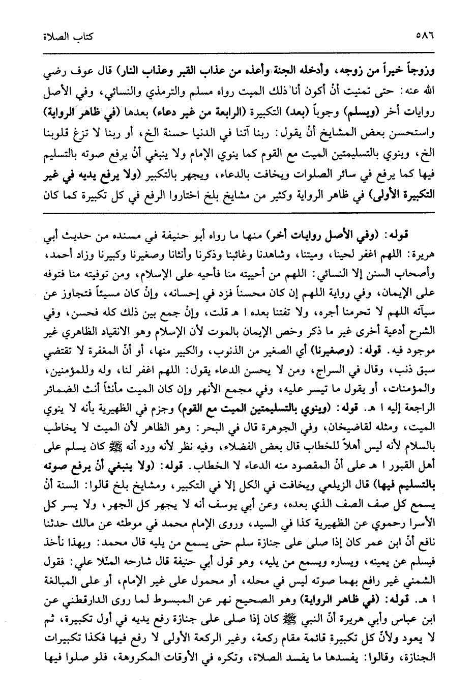 قوله: "وفي الأصل روايات أخر" منها ما رواه أبو حنيفة في مسنده من حديث أبي هريرة اللهم اغفر لحينا وميتنا وشاهدنا وغائبنا وذكرنا وأنثانا وصغيرنا وكبيرنا وزاد أحمد وأصحاب السنن إلا النسائي اللهم من أحييته منا فأحيه على الإسلام ومن توفيته منا فتوفه على الإيمان وفي رواية اللهم إن كان محسنا فزد في إحسانه وإن كان مسيئا فتجاوز عن سيآته اللهم لا تحرمنا أجره ولا تفتنا بعده اهـ قلت وإن جمع بين ذلك كله فحسن وفي الشرح أدعية أخرى غير ما ذكر وخص الإيمان بالموت لأن الإسلام وهو الانقياد الظاهري غير موجود فيه قوله: "وصغيرنا" أي الصغير من الذنوب والكبير منها أو أن المغفرة لا تقتضي سبق ذنب وقال في السراج ومن لا يحسن الدعاء يقول اللهم اغفر لنا وله وللمؤمنين والمؤمنات أو يقول ما تيسر عليه وفي مجمع الأنهر وإن كان الميت مأنثا أنث الضمائر الراجعة إليه اهـ قوله: "وينوي بالتسليمتين الميت مع القوم" وجزم في الظهيرية بأنه لا ينوي الميت ومثله لقاضيخان وفي الجوهرة قال في البحر وهو الظاهر لأن الميت لا يخاطب بالسلام لأنه ليس أهلا للخطاب قال بعض الفضلاء وفيه نظر لأنه ورد أنه صلى الله عليه وسلم كان يسلم على أهل القبور اهـ على أن المقصود منه الدعاء لا الخطاب قوله: "ولا ينبغي أن يرفع صوته بالتسليم فيها" قال الزيلعي ويخافت في الكل إلا في التكبير ومشايخ بلخ قالوا: السنة أن يسمع كل صف الصف الذي بعده وعن أبي يوسف أنه لا يجهر كل الجهر ولا يسر كل الأسرا رحموي عن الظهيرية كذا في السيد وروى الإمام محمد في موطئه عن مالك حدثنا نافع أن ابن عمر كان إذا صلى على جنازة سلم حتى يسمع من يليه قال محمد وبهذا نأخذ فيسلم عن يمينه ويساره ويسمع من يليه وهو قول أبي حنيفة قال شارحه المنلا علي فقول الشمني غير رافع بهما صوته ليس في محله أو محمول على غير الإمام أو على المبالغة اهـ قوله: "في ظاهر الرواية" وهو الصحيح نهر عن المبسوط لما روى الدارقطني عن ابن عباس وأبي هريرة أن النبي صلى الله عليه وسلم كان إذا صلى على جنازة رفع يديه في أول تكبيرة ثم لا يعود ولأن كل تكبيرة قائمة مقام ركعة وغير الركعة الأولى لا رفع فيها فكذا تكبيرات الجنازة وقالوا: يفسدها ما يفسد الصلاة وتكره في الأوقات المكروهة فلو صلوا فيها