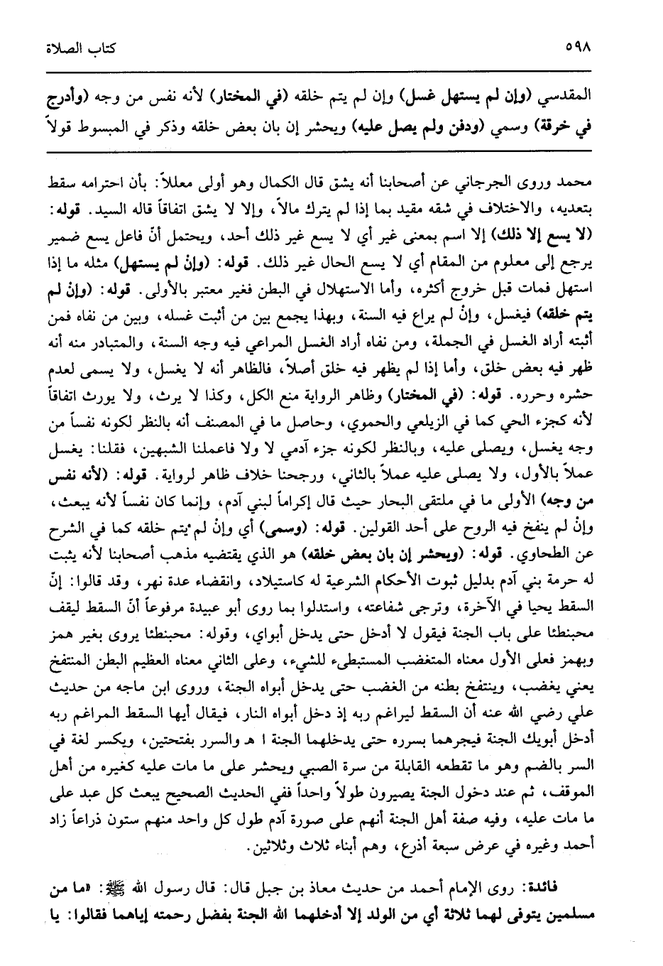 المقدسي "وإن لم يستهل غسل" وإن لم يتم خلقه "في المختار" لأنه نفس من وجه "وأدرج في خرقة" وسمي "ودفن ولم يصل عليه" ويحشر إن بان بعض خلقه وذكر في المبسوط قولا