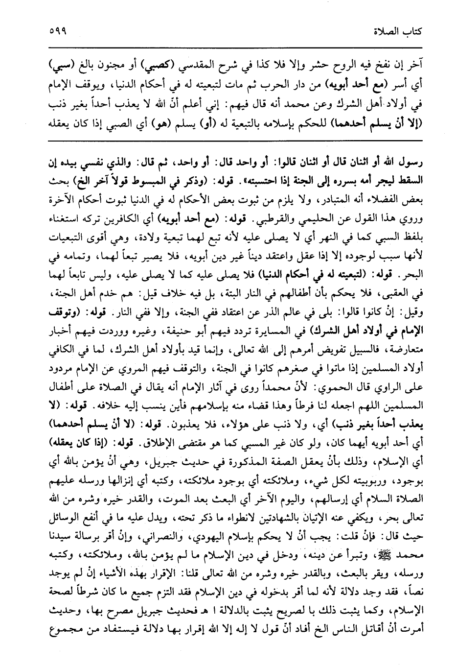 رسول الله أو اثنان قال: "أو اثنان" قالوا: أو واحد قال: "أو واحد" ثم قال: "والذي نفسي بيده إن السقط ليجر أمه بسرره إلى الجنة إذا احتسبته" قوله: "وذكر في المبسوط قولا آخر الخ" بحث بعض الفضلاء أنه المتبادر ولا يلزم من ثبوت بعض الأحكام له في الدنيا ثبوت أحكام الآخرة وروي هذا القول عن الحليمي والقرطبي قوله: "مع أحد أبويه" أي الكافرين تركه استغناء بلفظ السبي كما في النهر أي لا يصلى عليه لأنه تبع لهما تبعية ولادة وهي أقوى التبعيات لأنها سبب لوجوده إلا إذا عقل واعتقد دينا غير دين أبويه فلا يصير تبعا لهما وتمامه في البحر قوله: "لتبعيته له في أحكام الدنيا" فلا يصلى عليه كما لا يصلى عليه وليس تابعا لهما في العقبى فلا يحكم بأن أطفالهم في النار البتة بل فيه خلاف قيل هم خدم أهل الجنة وقيل إن كانوا قالوا: بلى في عالم الذر عن اعتقاد ففي الجنة وإلا ففي النار قوله: "وتوقف الإمام في أولاد أهل الشرك" في المسايرة تردد فيهم أبو حنيفة وغيره ووردت فيهم أخبار متعارضة فالسبيل تفويض أمرهم إلى الله تعالى وإنما قيد بأولاد أهل الشرك لما في الكافي أولاد المسلمين إذا ماتوا في صغرهم كانوا في الجنة والتوقف فيهم المروي عن الإمام مردود على الراوي قال الحموي لأن محمدا روى في آثار الإمام أنه يقال في الصلاة على أطفال المسلمين اللهم اجعله لنا فرطا وهذا قضاء منه بإسلامهم فأين ينسب إليه خلافه قوله: "لا يعذب أحدا بغير ذنب" أي ولا ذنب على هؤلاء فلا يعذبون قوله: "لا أن يسلم أحدهما" أي أحد أبويه أيهما كان ولو كان غير المسبي كما هو مقتضى الإطلاق قوله: "إذا كان يعقله" أي الإسلام وذلك بأن يعقل الصفة المذكورة في حديث جبريل وهي أن يؤمن بالله أي بوجود وربوبيته لكل شيء وملائكته أي بوجود ملائكته وكتبه أي إنزالها ورسله عليهم الصلاة السلام أي إرسالهم واليوم الآخر أي البعث بعد الموت والقدر خيره وشره من الله تعالى بحر ويكفي عنه الإتيان بالشهادتين لانطواء ما ذكر تحته ويدل عليه ما في أنفع الوسائل حيث قال فإن قلت يجب أن لا يحكم بإسلام اليهودي والنصراني وإن أقر برسالة سيدنا محمد صلى الله عليه وسلم وتبرأ عن دينه ودخل في دين الإسلام ما لم يؤمن بالله وملائكته وكتبه ورسله ويقر بالبعث وبالقدر خيره وشره من الله تعالى قلنا الإقرار بهذه الأشياء إن لم يوجد نصا فقد وجد دلالة لأنه لما أقر بدخوله في دين الإسلام فقد التزم جميع ما كان شرطا لصحة الإسلام وكما يثبت ذلك با لصريح يثبت بالدلالة اهـ فحديث جبريل مصرح بها وحديث أمرت أن أقاتل الناس الخ أفاد أن قول لا إله إلا الله إقرار بها دلالة فيستفاد من مجموع