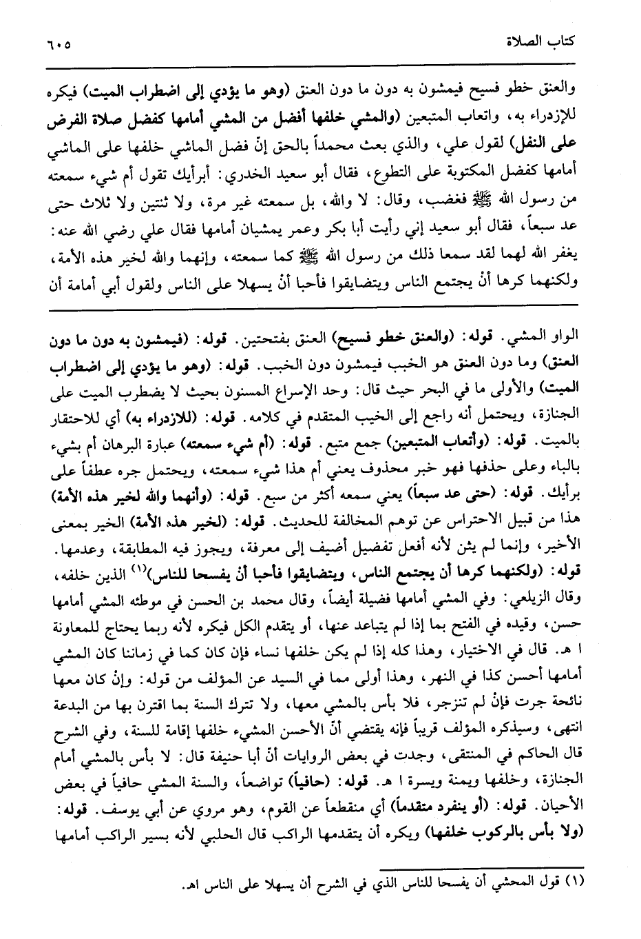 والعنق خطو فسيح فيمشون به دون ما دون العنق "وهو ما يؤدي إلى اضطراب الميت" فيكره للازدراء به وإتعاب المتبعين "والمشي خلفها أفضل من المشي أمامها كفضل صلاة الفرض على النفل" لقول علي: "والذي بعث محمدا بالحق إن فضل المشي خلفها على الماشي أمامها كفضل المكتوبة على التطوع". فقال أبو سعيد الخدري: "أبرأيك تقول أم بشيء سمعته من رسول الله صلى الله عليه وسلم؟ " فغضب وقال: " لا والله بل سمعته غير مرة لا اثنتين ولا ثلاث حتى عد سبعا" فقال أبو سعيد: "إني رأيت أبا بكر وعمر يمشيان أمامها" فقال علي رضي الله عنه" يغفر الله لهما لقد سمعا ذلك من رسول الله صلى الله عليه وسلم كما سمعته وإنهما والله لخير هذه الأمة ولكنهما كرها أن يجتمع الناس ويتضايقوا فأحبا أن يسهلا على الناس" ولقول أبي أسامة "إن