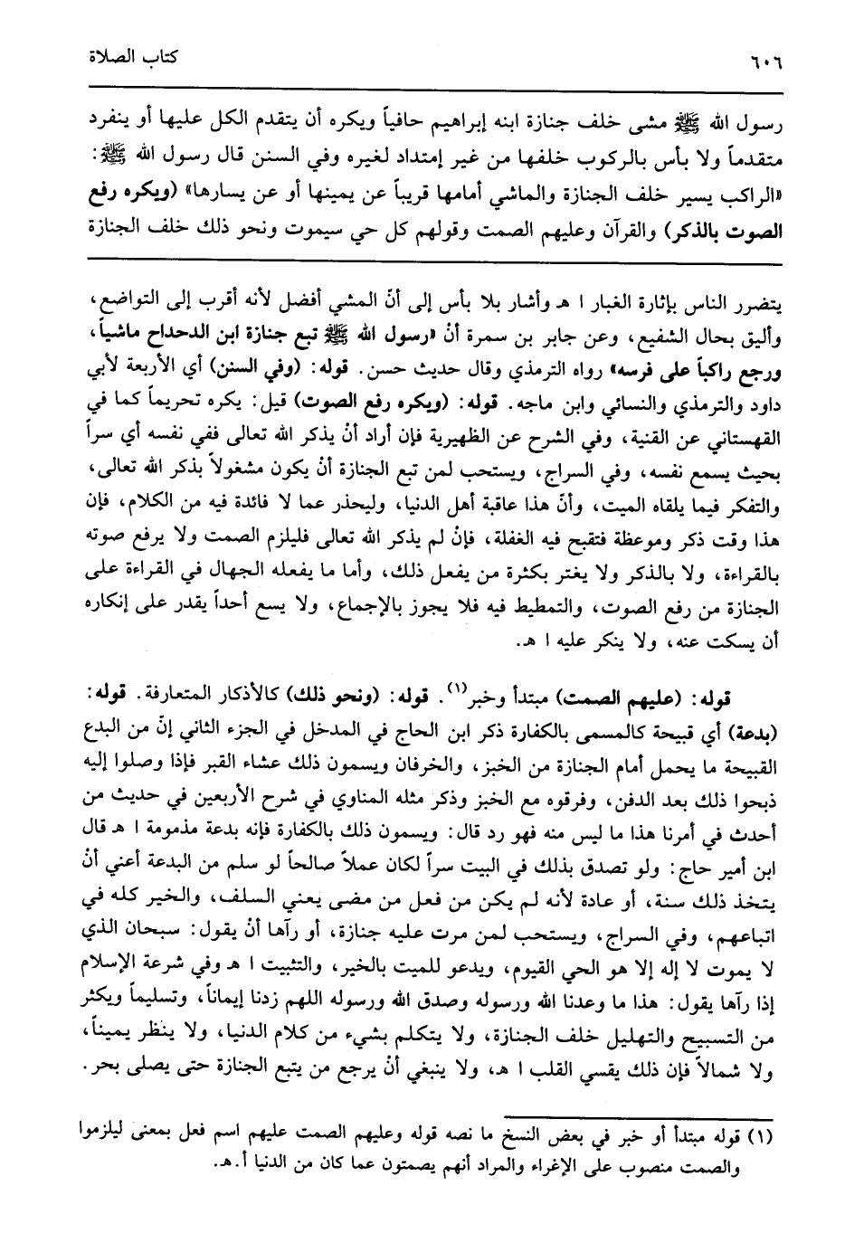 رسول الله صلى الله عليه وسلم مشى خلف جنازة ابنه إبراهيم حافيا. ويكره أن يتقدم الكل عليها أو ينفرد واحد متقدما ولا بأس بالركوب خلفها من غير إضرار لغيره في السنن قال رسول الله صلى الله عليه وسلم: "الراكب يسير خلف الجنازة والماشي أمامها قريبا منها عن يمينها أو عن يسارها" "ويكره رفع الصوت بالذكر" والقرآن وعليهم الصمت وقولهم كل حي سيموت ونحو ذلك خلف الجنازة