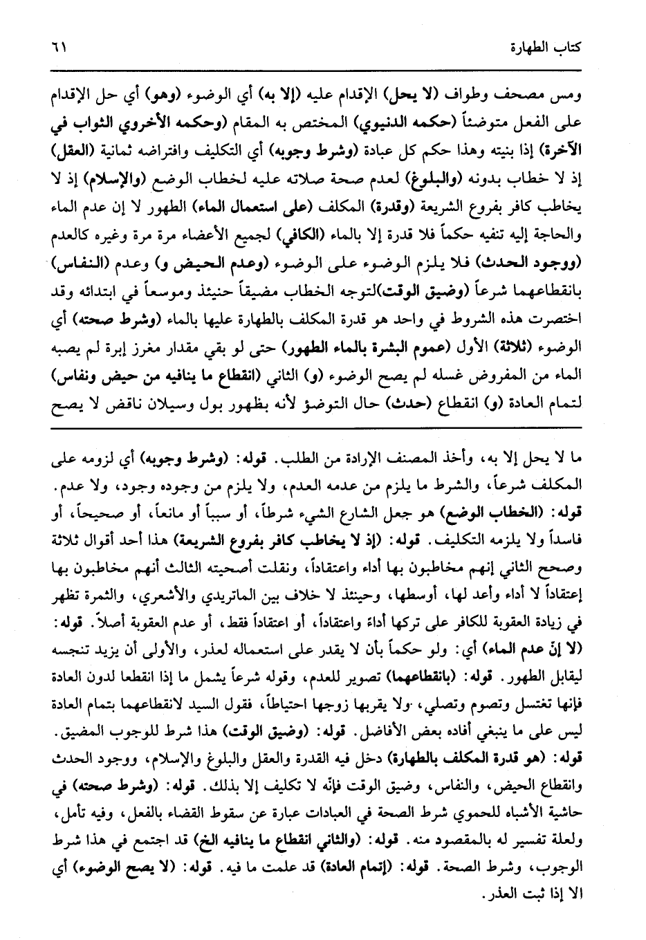 ما لا يحل إلا به وأخذ المصنف الإرادة من الطلب قوله: "وشرط وجوبه" أي لزومه على المكلف شرعا والشرط ما يلزم من عدمه العدم ولا يلزم من وجوده وجود ولا عدم قوله: "الخطاب الوضع" هو جعل الشارع الشيء شرطا أو سببا أو مانعا أو صحيحا أو فاسدا ولا يلزمه التكليف قوله: "إذ لا يخاطب كافر بفروع الشريعة" هذا أحد أقوال ثلاثة وصحح الثاني إنهم مخاطبون بها أداء واعتقادا ونقلت أصحيته الثالث إنهم مخاطبون بها إعتقادا لا أداء وأعد لها أوسطها وحينئذ لا خلاف بين الماتريدي والأشعري والثمرة تظهر في زيادة العقوبة للكافر على تركها أداء واعتقادا أو اعتقادا فقط أو عدم العقوبة أصلا قوله: "لا إن عدم الماء" أي ولو حكما بأن لا يقدر على استعماله لعذر والأولى أن يزيد تنجسه ليقابل الطهور قوله: "بانقطاعهما" تصوير للعدم وقوله شرعا يشمل ما إذا انقطعا لدون العادة فإنها تغتسل وتصوم وتصلي ولا يقربها زوجها احتياطا فقول السيد لانقطاعهما بتمام العادة ليس على ما ينبغي أفاده بعض الأفاضل قوله: "وضيق الوقت" هذا شرط للوجوب المضيق قوله: "هو قدرة المكلف بالطهارة" دخل فيه القدرة والعقل والبلوغ والإسلام ووجود الحدث وانقطاع الحيض والنفاس وضيق الوقت فإنه لا تكليف إلا بذلك قوله: "وشرط صحته" في حاشية الأشباه للحموي شرط الصحة في العبادات عبارة عن سقوط القضاء بالفعل وفيه تأمل ولعله تفسير له بالمقصود منه قوله: "والثاني انقطاع ما ينافيه الخ" قد اجتمع في هذا شرط الوجوب وشرط الصحة قوله: "إتمام العادة" قد علمت ما فيه قوله: "لا يصح الوضوء" أي إلا إذا ثبت العذر.