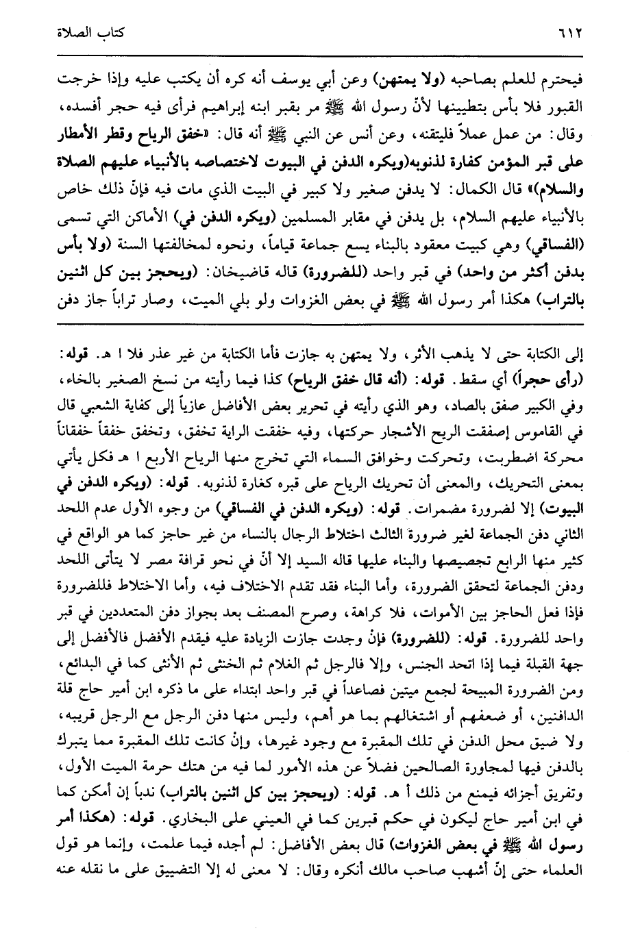 إلى الكتابة حتى لا يذهب الأثر ولا يمتهن به جازت فأما الكتابة من غير عذر فلا اهـ قوله: "رأى حجرا" أي سقط قوله: "أنه قال خفق الرياح" كذا فيما رأيته من نسخ الصغير بالخاء وفي الكبير صفق بالصاد وهو الذي رأيته في تحرير بعض الأفاضل عازيا إلى كفاية الشعبي قال في القاموس إصفقت الريح الأشجار حركتها وفيه خفقت الراية تخفق وتخفق خفقا خفقانا محركة اضطربت وتحركت وخوافق السماء التي تخرج منها الرياح الأربع اهـ فكل يأتي بمعنى التحريك والمعنى أن تحريك الرياح على قبره كغارة لذنوبه قوله: "ويكره الدفن في البيوت" إلا لضرورة مضمرات قوله: "ويكره الدفن في الفساقي" من وجوه الأول عدم اللحد الثاني دفن الجماعة لغير ضرورة الثالث اختلاط الرجال بالنساء من غير حاجز كما هو الواقع في كثير منها الرابع تجصيصها والبناء عليها قاله السيد إلا أن في نحو قرافة مصر لا يتأتى اللحد ودفن الجماعة لتحقق الضرورة وأما البناء فقد تقدم الاختلاف فيه وأما الاختلاط فللضرورة فإذا فعل الحاجز بين الأموات فلا كراهة وصرح المصنف بعد بجواز دفن المتعددين في قبر واحد للضرورة قوله: "للضرورة" فإن وجدت جازت الزيادة عليه فيقدم الأفضل فالأفضل إلى جهة القبلة فيما إذا اتحد الجنس وإلا فالرجل ثم الغلام ثم الخنثى ثم الأنثى كما في البدائع ومن الضرورة المبيحة لجمع ميتين فصاعدا في قبر واحد ابتداء على ما ذكره ابن أمير حاج قلة الدافنين أو ضعفهم أو اشتغالهم بما هو أهم وليس منها دفن الرجل مع الرجل قريبه ولا ضيق محل الدفن في تلك المقبرة مع وجود غيرها وإن كانت تلك المقبرة مما يتبرك بالدفن فيها لمجاورة الصالحين فضلا عن هذه الأمور لما فيه من هتك حرمة الميت الأول وتفريق أجزائه فيمنع من ذلك اهـ قوله: "ويحجز بين كل اثنين بالتراب" ندبا إن أمكن كما في ابن أمير حاج ليكون في حكم قبرين كما في العيني على البخاري قوله: "هكذا أمر رسول الله صلى الله عليه وسلم في بعض الغزوات" قال بعض الأفاضل لم أجده فيما علمت وإنما هو قول العلماء حتى إن أشهب صاحب مالك أنكره وقال لا معنى له إلا التضييق على ما نقله عنه
