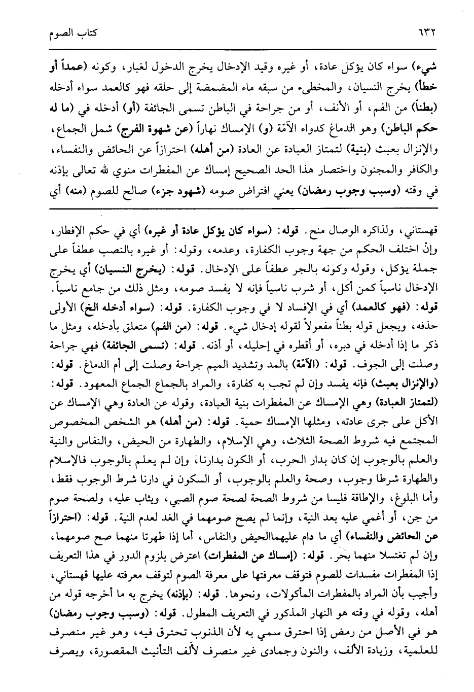 قهستاني ولذاكره الوصال منح قوله: "سواء كان يؤكل عادة أو غيره" أي في حكم الإفطار وإن اختلف الحكم من جهة وجوب الكفارة وعدمه وقوله أو غيره بالنصب عطفا على جملة يؤكل وقوله وكونه بالجر عطفا على الإدخال قوله: "يخرج النسيان" أي يخرج الإدخال ناسيا كمن أكل أو شرب ناسيا فإنه لا يفسد صومه ومثل ذلك من جامع ناسيا قوله: "فهو كالعمد" أي في الإفساد لا في وجوب الكفارة قوله: "سواء أدخله الخ" الأولى حذفه ويجعل قوله بطنا مفعولا لقوله إدخال شيء قوله: "من الفم" متعلق بأدخله ومثل ما ذكر ما إذا أدخله في دبره أو أقطره في إحليله أو أذنه قوله: "تسمى الجائفة" فهي جراحة وصلت إلى الجوف قوله: "الآمة" بالمد وتشديد الميم جراحة وصلت إلى أم الدماغ قوله: "والإنزال بعبث" فإنه يفسد وإن لم تجب به كفارة والمراد بالجماع الجماع المعهود قوله: "لتمتاز العبادة" وهي الإمساك عن المفطرات بنية العبادة وقوله عن العادة وهي الإمساك عن الأكل على جرى عادته ومثلها الإمساك حمية قوله: "من أهله" هو الشخص المخصوص المجتمع فيه شروط الصحة الثلاث وهي الإسلام والطهارة من الحيض والنفاس والنية والعلم بالوجوب إن كان بدار الحرب أو الكون بدارنا وإن لم يعلم بالوجوب فالإسلام والطهارة شرطا وجوب وصحة والعلم بالوجوب أو السكون في دارنا شرط الوجوب فقط وأما البلوغ والإطاقة فليسا من شروط الصحة لصحة صوم الصبي ويثاب عليه ولصحة صوم من جن أو أغمي عليه بعد النية وإنما لم يصح صومهما في الغد لعدم النية قوله: "احترازا عن الحائض والنفساء" أي ما دام عليهماالحيض والنفاس أما إذا طهرتا منهما صح صومهما وإن لم تغتسلا منهما بحر قوله: "إمساك عن المفطرات" اعترض بلزوم الدور في هذا التعريف إذا المفطرات مفسدات للصوم فتوقف معرفتها على معرفة الصوم لتوقف معرفته عليها قهستاني وأجيب بأن المراد بالمفطرات المأكولات ونحوها قوله: "بإذنه" يخرج به ما أخرجه قوله من أهله وقوله في وقته هو النهار المذكور في التعريف المطول قوله: "وسبب وجوب رمضان" هو في الأصل من رمض إذا احترق سمي به لأن الذنوب تحترق فيه وهو غير منصرف للعلمية وزيادة الألف والنون وجمادى غير منصرف لألف التأنيث المقصورة ويصرف
