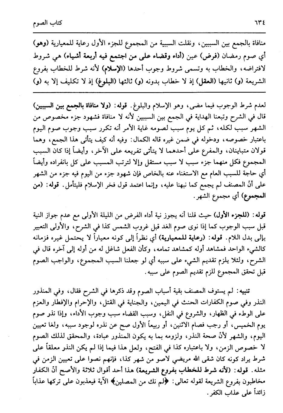 قوله: "للجزء الأول" حيث قلنا أنه يجوز نية أداء الفرض من الليلة الأولى مع عدم جواز النية قبل سبب الوجوب كما إذا نوى صوم الغد قبل غروب الشمس كذا في الشرح والأولى التعبير بإلى بدل اللام قوله: "رعاية للمعيارية" أي نظرا إلى كونه معيارا لا يحتمل غيره فزمانه كالشيء الواحد فمشاهد أوله كمشاهد تمامه وكأن الفعل شاغل له من أوله إلى آخره قال في الشرح ولئلا يلزم تقديم الشيء على سببه أي لو جعلنا السبب المجموع والواجب الصوم قبل تحقق المجموع للزم تقديم الصوم على سببه.