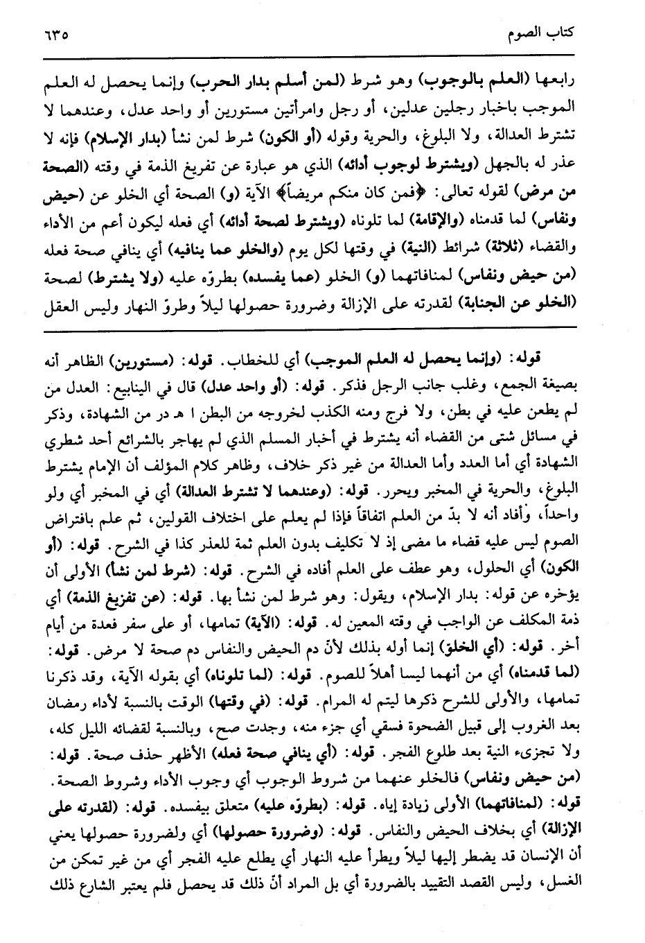 قوله: "وإنما يحصل له العلم الموجب" أي للخطاب قوله: "مستورين" الظاهر أنه بصيغة الجمع وغلب جانب الرجل فذكر قوله: "أو واحد عدل" قال في الينابيع العدل من لم يطعن عليه في بطن ولا فرج ومنه الكذب لخروجه من البطن اهـ در من الشهادة وذكر في مسائل شتى من القضاء أنه يشترط في أخبار المسلم الذي لم يهاجر بالشرائع أحد شطري الشهادة أي أما العدد وأما العدالة من غير ذكر خلاف وظاهر كلام المؤلف أن الإمام يشترط البلوغ والحرية في المخبر ويحرر قوله: "وعندهما لا تشترط العدالة" أي في المخبر أي ولو واحدا وأفاد أنه لا بد من العلم اتفاقا فإذا لم يعلم على اختلاف القولين ثم علم بافتراض الصوم ليس عليه قضاء ما مضى إذ لا تكليف بدون العلم ثمة للعذر كذا في الشرح قوله: "أو الكون" أي الحلول وهو عطف على العلم أفاده في الشرح قوله: "شرط لمن نشأ" الأولى أن يؤخره عن قوله بدار الإسلام ويقول وهو شرط لمن نشأ بها قوله: "عن تفزيغ الذمة" أي ذمة المكلف عن الواجب في وقته المعين له قوله: "الآية" تمامها أو على سفر فعدة من أيام أخر قوله: "أي الخلو" إنما أوله بذلك لأن دم الحيض والنفاس دم صحة لا مرض قوله: "لما قدمناه" أي من أنهما ليسا أهلا للصوم قوله: "لما تلوناه" أي بقوله الآية وقد ذكرنا تمامها والأولى للشرح ذكرها ليتم له المرام قوله: "في وقتها" الوقت بالنسبة لأداء رمضان بعد الغروب إلى قبيل الضحوة فسقي أي جزء منه وجدت صح وبالنسبة لقضائه الليل كله ولا تجزىء النية بعد طلوع الفجر قوله: "أي ينافي صحة فعله" الأظهر حذف صحة قوله: "من حيض ونفاس" فالخلو عنهما من شروط الوجوب أي وجوب الأداء وشروط الصحة قوله: "لمنافاتهما" الأولى زيادة إياه قوله: "بطروه عليه" متعلق بيفسده قوله: "لقدرته على الإزالة" أي بخلاف الحيض والنفاس قوله: "وضرورة حصولها" أي ولضرورة حصولها يعني أن الإنسان قد يضطر إليها ليلا ويطرأ عليه النهار أي يطلع عليه الفجر أي من غير تمكن من الغسل وليس القصد التقييد بالضرورة أي بل المراد أن ذلك قد يحصل فلم يعتبر الشارع ذلك