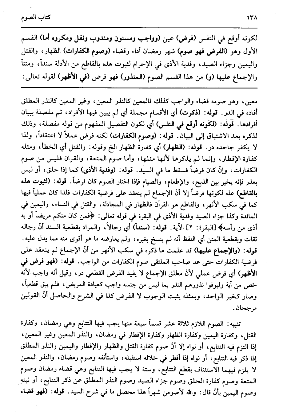 معين وهو صومه قضاء والواجب كذلك فالمعين كالنذر المعين وغير المعين كالنذر المطلق أفاده في الدر قوله: "ذكرت" أي الأقسام مجملة أي لم يبين فيها الأفراد ثم مفصلة ببيان أفرادها قوله: "لكونه أوقع في النفس" أي لكون التفصيل المفهوم من قوله مفصلة وذلك لذكره بعد الاشتياق إلى البيان قوله: "وصوم الكفارات" لكنه فرض عملا لا اعتقادا ولذا لا يكفر جاحده در قوله: "الظهار" أي كفارة الظهار الخ وقوله والقتل أي الخطأ ومثله كفارة الإفطار وإنما لم يذكرها لأنها مثلها وأما صوم المتعة والقران فليس من صوم الكفارات وإن كان فرضا فسقط ما في السيد قوله: "وفدية الأذى" كما إذا حلق أو لبس بعذر فإنه يخير بين الذبح والإطعام والصيام فإذا اختار الصوم كان فرضا قوله: "لثبوت هذه بالقاطع" عله لكونها فرضا إلا أن الإجماع لم ينعقد على فرضية الكفارات فلذا كان عمليا فيها كما في سكب الأنهر والقاطع هو القرآن فالظهار في المجادلة والقتل في النساء واليمين في المائدة وكذا جزاء الصيد وفدية الأذى في البقرة في قوله تعالى: {فَمَنْ كَانَ مِنْكُمْ مَرِيضاً أَوْ بِهِ أَذىً مِنْ رَأْسِهِ} [البقرة: 196] الآية قوله: "سندا" أي رجالا والمراد بقطعية السند أن رجاله ثقات وبقطعية المتن أي اللفظ أنه لم ينسخ بغيره ولم يعارضه ما هو أقوى منه مما يدل عليه قوله: "والإجماع عليها" قد علمت ما ذكره في سكب الأنهر من أن الإجماع لم ينعقد على فرضية الكفارات حتى عد صاحب الملتقى صوم الكفارات من الواجب قوله: "فهو فرض في الأظهر" أي فرض عملي لأن مطلق الإجماع لا يفيد الفرض القطعي در وقيل أنه واجب لأنه خص من آية وليوفوا نذورهم النذر بما ليس من جنسه واجب كعيادة المريض فلم يبق قطعيا وصار كخبر الواحد وبمثله يثبت الوجوب لا الفرض كذا في الشرح والحاصل أن القولين مرجحان.