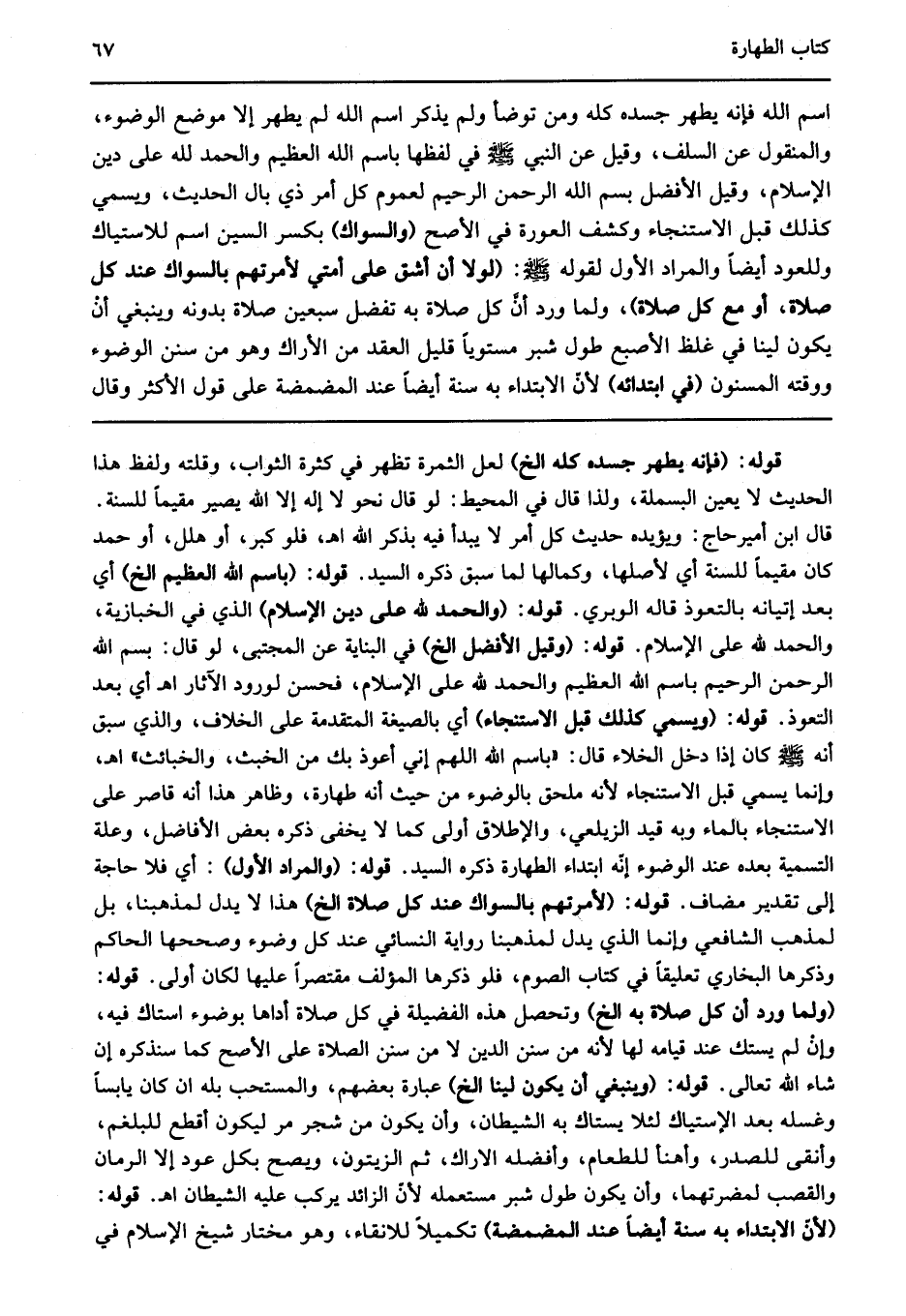 اسم الله فإنه يطهر جسده كله ومن توضأ ولم يذكر اسم الله لم يطهر إلا موضع الوضوء" والمنقول عن السلف وقيل عن النبي صلى الله عليه وسلم في لفظها باسم الله العظيم والحمد لله على دين الإسلام وقيل الأفضل بسم الله الرحمن الرحيم لعموم "كل ذي بال" الحديث ويسمي كذلك قبل الاستنجاء وكشف العورة في الأصح "والسواك" بكسر السين اسم للاستياك والعود أيضا والمراد الأول لقوله صلى الله عليه وسلم: "لولا أن أشق على أمتي لأمرتهم بالسواك عند كل صلاة" أو "مع كل صلاة" ولما ورد أن كل صلاة به تفضل سبعين صلاة بدونه. وينبغي أن يكون لينا في غلظ الأصبع طول شبر مستويا قليل العقد من الأراك وهو من سنن الوضوء ووقته المسنون "في ابتدائه" لأن الابتداء به سنة أيضا عند المضمضة على قول الأكثر وقال.