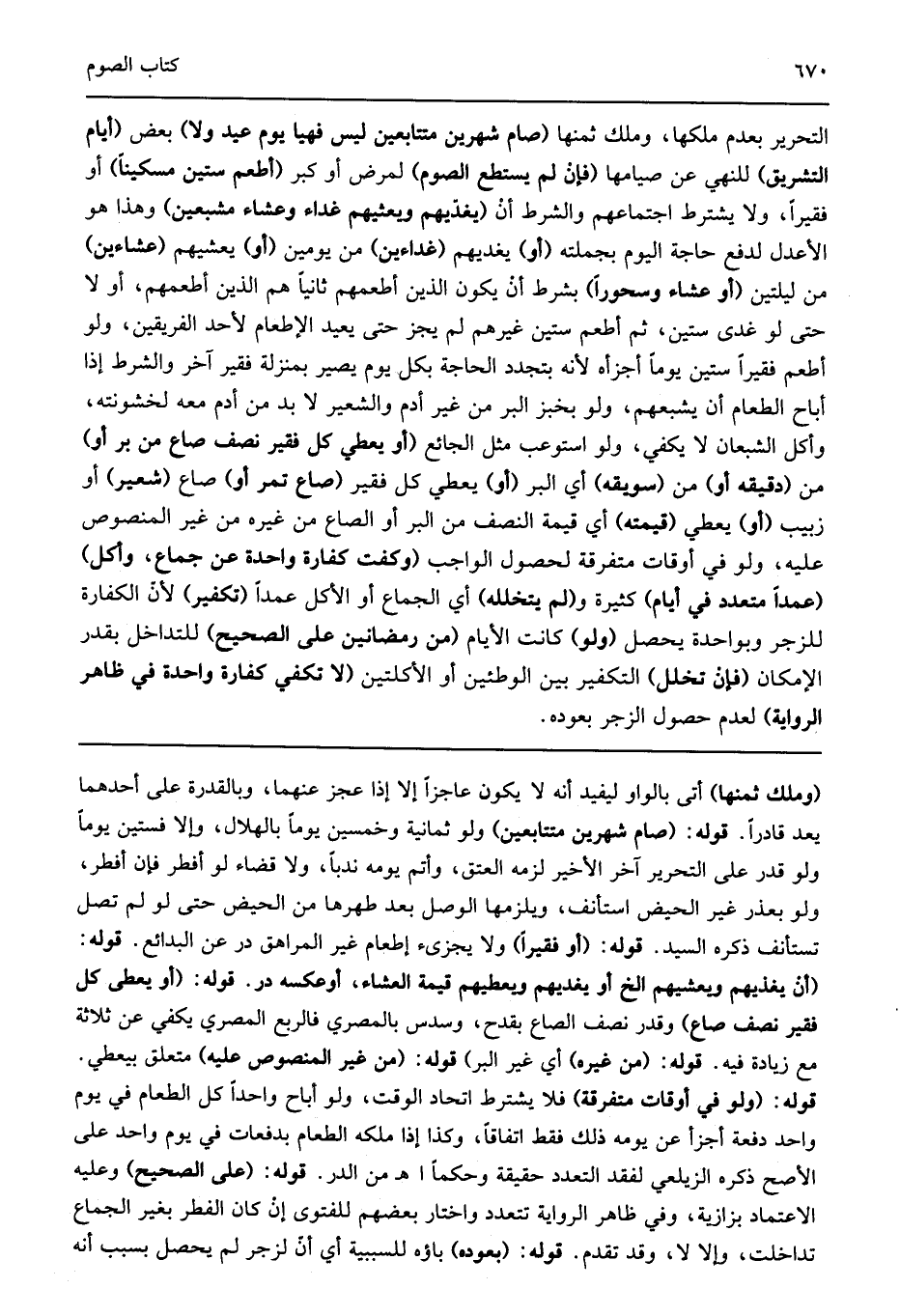 التحرير بعدم ملكها وملك ثمنها "صام شهرين متتابعين فيهما يوم عيد ولا" بعض "أيام التشريق" للنهي عن صيامها "فإن لم يستطع الصوم" لمرض أو كبر "أطعم ستين مسكينا" أو فقيرا ولا يشترط اجتماعهم والشرط أن "يغديهم ويعشيهم غداء وعشاء مشبعين" وهذا هو الأعدل لدفع حاجة اليوم بجملته" "أو" يغديهم "غداءين" من يومين "أو" يعشيهم "عشاءين" من ليلتين "أو عشاء وسحورا" بشرط أن يكون الذين أطعمهم ثانيا هم الذين أطعمهم أولا حتى لو غدى ستين ثم أطعم ستين غيرهم لم يجز حتى يعيد الإطعام لأحد الفريقين ولو أطعم فقيرا ستين يوما أجزأه لأنه بتجدد الحاجة بكل يوم يصير بمنزلة فقيرا آخر والشرط إذا أباح الطعام أن يشبعهم ولو بخبز البر من غير أدم والشعير لا بد من أدم معه لخشونته وأكل الشبعان لا يكفي ولو استوعب مثل الجائع "أو يعطي كل فقير نصف صاع من بر أو" من "دقيقه أو" من "سويقه" أي البر "يعطى كل فقير "صاع تمر أو" صاع "شعير" أو زبيب "أو" يعطي "قيمته" النصف من البر أو الصاع من غيره من غير المنصوص عليه ولو في أوقات متفرقة لحصول الواجب "وكفت كفارة واحدة عن جماع وأكل" عمدا "متعددة في أيام" كثيرة و "لم يتخلله" أي الجماع أو لأطل عمدا "تكفير" لأن الكفارة للزجر وبواحدة يحصل "ولو" كانت الأيام "من رمضانين على الصحيح" للتداخل قدر الإمكان "فإن تخلل" التكفير بين الوطأين أو الأكلتين "لا تكفي كفارة واحدة في ظاهر الراوية" لعدم حصول الزجر بعوده