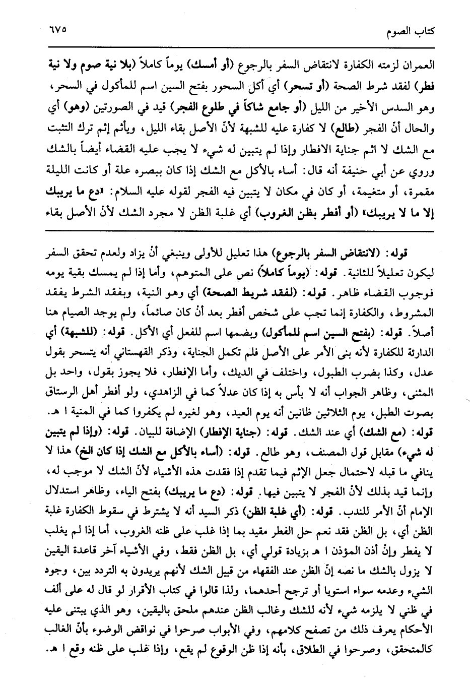 قوله: "لانتقاض السفر بالرجوع" هذا تعليل للأولى وينبغي أن يزاد ولعدم تحقق السفر ليكون تعليلا للثانية قوله: "يوما كاملا" نص على المتوهم وأما إذا لم يمسك بقية يومه فوجوب القضاء ظاهر قوله: "لفقد شريط الصحة" أي وهو النية وبفقد الشرط يفقد المشروط والكفارة إنما تجب على شخص أفطر بعد أن كان صائما ولم يوجد الصيام هنا أصلا قوله: "بفتح السين اسم للمأكول" وبضمها اسم للفعل أي الأكل قوله: "للشبهة" أي الدارئة للكفارة لأنه بنى الأمر على الأصل فلم تكمل الجناية وذكر القهستاني أنه يتسحر بقول عدل وكذا بضرب الطبول واختلف في الديك وأما الإفطار فلا يجوز بقول واحد بل المثنى وظاهر الجواب أنه لا بأس به إذا كان عدلا كما في الزاهدي ولو أفطر أهل الرستاق بصوت الطبل يوم الثلاثين ظانين أنه يوم العيد وهو لغيره لم يكفروا كما في المنية اهـ قوله: "مع الشك" أي عند الشك قوله: "جناية الإفطار" الإضافة للبيان قوله: "وإذا لم يتبين له شيء" مقابل قول المصنف وهو طالع قوله: "أساء بالأكل مع الشك إذا كان الخ" هذا لا ينافي ما قبله لاحتمال جعل الإثم فيما تقدم إذا فقدت هذه الأشياء لأن الشك لا موجب له وإنما قيد بذلك لأن الفجر لا يتبين فيها قوله: "دع ما يريبك" بفتح الياء وظاهر استدلال الإمام أن الأمر للندب قوله: "أي غلبة الظن" ذكر السيد أنه لا يشترط في سقوط الكفارة غلبة الظن أي بل الظن فقد نعم حل الفطر مقيد بما إذا غلب على ظنه الغروب أما إذا لم يغلب لا يفطر وإن أذن المؤذن اهـ بزيادة قولي أي بل الظن فقط وفي الأشياء آخر قاعدة اليقين لا يزول بالشك ما نصه إن الظن عند الفقهاء من قبيل الشك لأنهم يريدون به التردد بين وجود الشيء وعدمه سواء استويا أو ترجح أحدهما ولذا قالوا: في كتاب الأقرار لو قال له على ألف في ظني لا يلزمه شيء لأنه للشك وغالب الظن عندهم ملحق باليقين وهو الذي يبتنى عليه الأحكام يعرف ذلك من تصفح كلامهم وفي الأبواب صرحوا في نواقض الوضوء بأن الغالب كالمتحقق وصرحوا في الطلاق بأنه إذا ظن الوقوع لم يقع وإذا غلب على ظنه وقع اهـ