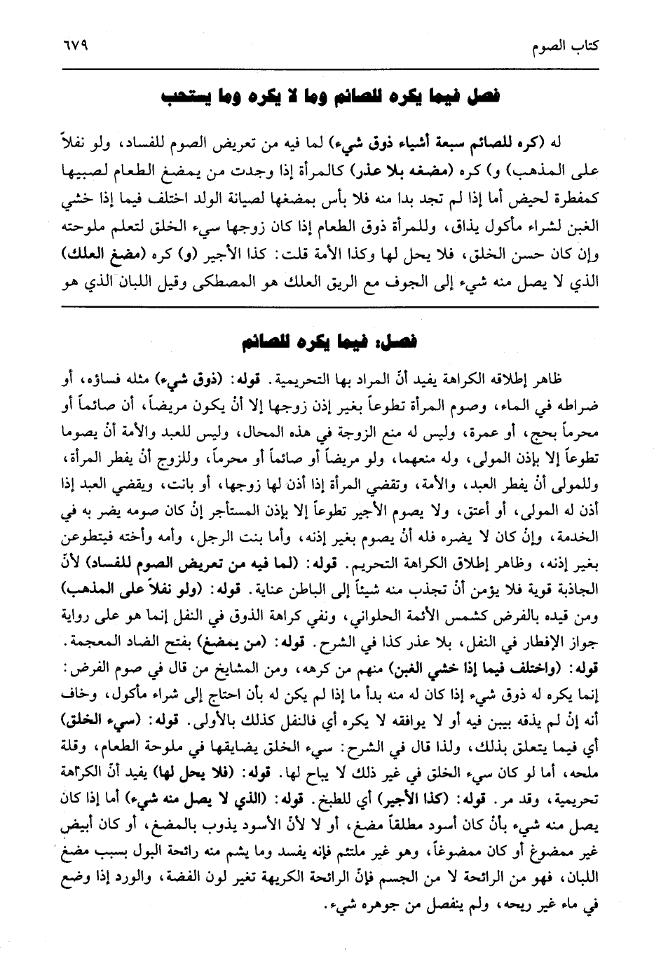ظاهر إطلاقه الكراهة يفيد أن المراد بها التحريمية قوله: "ذوق شيء" مثله فساؤه أو ضراطه في الماء وصوم المرأة تطوعا بغير إذن زوجها إلا أن يكون مريضا أن صائما أو محرما بحج أو عمرة وليس له منع الزوجة في هذه المحال وليس للعبد والأمة أم يصوما تطوعا إلا بإذن المولى وله منعهما ولو مريضا أو صائما أو محرما وللزوج أن يفطر المرأة وللمولى أن يفطر العبد والأمة وتقضي المرأة إذا أذن لها زوجها أو بانت ويقضي العبد إذا أذن له المولى أو أعتق ولا يصوم الأجير تطوعا إلا بإذن المستأجر إن كان صومه يضر به في الخدمة وإن كان لا يضره فله أن يصوم بغير إذنه وأما بنت الرجل وأمه وأخته فيتطوعن بغير إذنه وظاهر إطلاق الكراهة التحريم قوله: "لما فيه من تعريض الصوم للفساد" لأن الجاذبة قوية فلا يؤمن أن تجذب منه شيئا إلى الباطن عناية قوله: "ولو نفلا على المذهب" ومن قيده بالفرض كشمس الأئمة الحلواني ونفي كراهة الذوق في النفل إنما هو على رواية جواز الإفطار في النفل بلا عذر كذا في الشرح قوله: "من يمضغ" بفتح الضاد المعجمة قوله: "واختلف فيما إذا خشي الغبن" منهم من كرهه ومن المشايخ من قال في صوم الفرض إنما يكره له ذوق شيء إذا كان له منه بدأ ما إذا لم يكن له بأن احتاج إلى شراء مأكول وخاف أنه إن لم يذقه بيبن فيه أو لا يوافقه لا يكره أي فالنفل كذلك بالأولى قوله: "سيء الخلق" أي فيما يتعلق بذلك ولذا قال في الشرح سيء الخلق يضايقها في ملوحة الطعام وقلة ملحه أما لو كان سيء الخلق في غير ذلك لا يباح لها قوله: "فلا يحل لها" يفيد أن الكراهة تحريمية وقد مر قوله: "كذا الأجير" أي للطبخ قوله: "الذي لا يصل منه شيء" أما إذا كان يصل منه شيء بأن كان أسود مطلقا مضغ أو لا لأن الأسود يذوب بالمضغ أو كان أبيض غير ممضوغ أو كان ممضوغا وهو غير ملتئم فإنه يفسد وما يشم منه رائحة البول بسبب مضغ اللبان فهو من الرائحة لا من الجسم فإن الرائحة الكريهة تغير لون الفضة والورد إذا وضع في ماء غير ريحه ولم ينفصل من جوهره شيء.