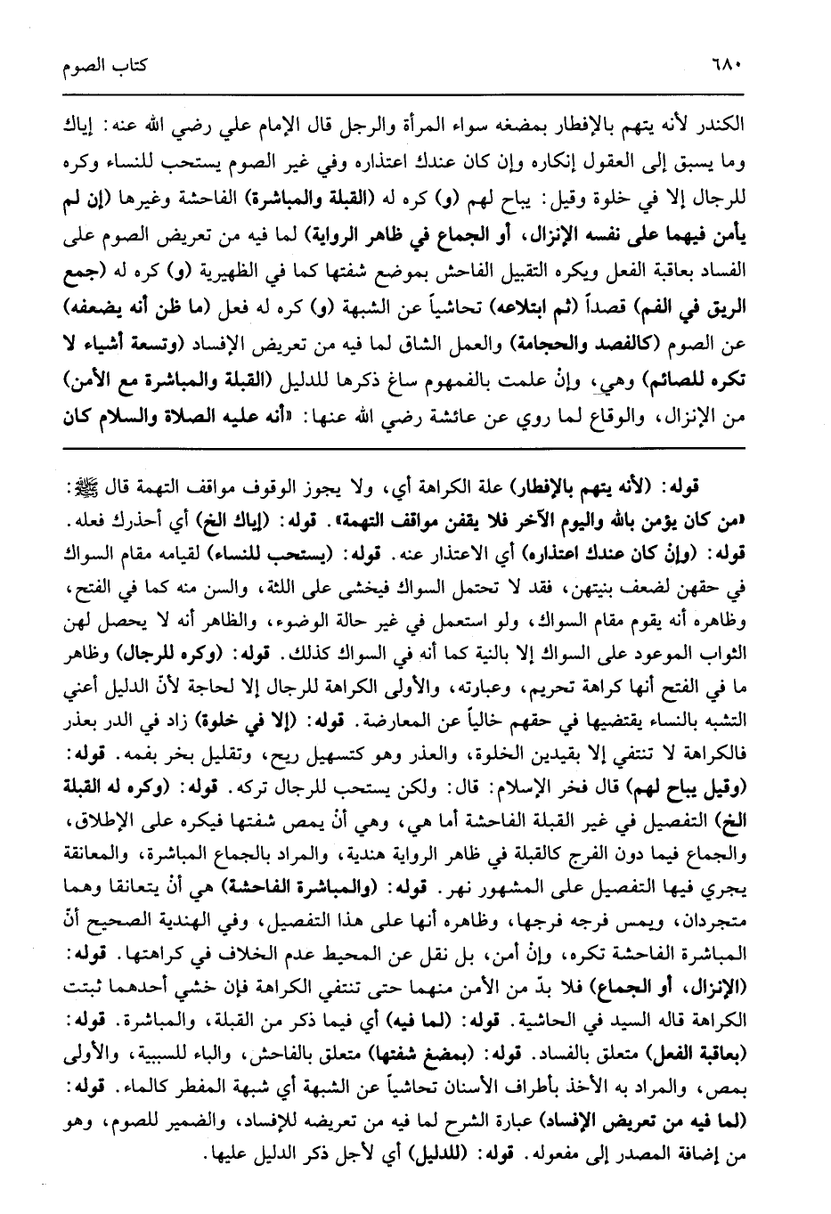 قوله: "لأنه يتهم بالإفطار" علة الكراهة أي ولا يجوز الوقوف مواقف التهمة قال صلى الله عليه وسلم: "من كان يؤمن بالله واليوم الآخر فلا يقفن مواقف التهمة" قوله: "إياك الخ" أي أحذرك فعله قوله: "وإن كان عندك اعتذاره" أي الاعتذار عنه قوله: "يستحب للنساء" لقيامه مقام السواك في حقهن لضعف بنيتهن فقد لا تحتمل السواك فيخشى على اللثة والسن منه كما في الفتح وظاهره أنه يقوم مقام السواك ولو استعمل في غير حالة الوضوء والظاهر أنه لا يحصل لهن الثواب الموعود على السواك إلا بالنية كما أنه في السواك كذلك قوله: "وكره للرجال" وظاهر ما في الفتح أنها كراهة تحريم وعبارته والأولى الكراهة للرجال إلا لحاجة لأن الدليل أعني التشبه بالنساء يقتضيها في حقهم خاليا عن المعارضة قوله: "إلا في خلوة" زاد في الدر بعذر فالكراهة لا تنتفي إلا بقيدين الخلوة والعذر وهو كتسهيل ريح وتقليل بخر بفمه قوله: "وقيل يباح لهم" قال فخر الإسلام قال ولكن يستحب للرجال تركه قوله: "وكره له القبلة الخ" التفصيل في غير القبلة الفاحشة أما هي وهي أن يمص شفتها فيكره على الإطلاق والجماع فيما دون الفرج كالقبلة في ظاهر الرواية هندية والمراد بالجماع المباشرة والمعانقة يجري فيها التفصيل على المشهور نهر قوله: "والمباشرة الفاحشة" هي أن يتعانقا وهما متجردان ويمس فرجه فرجها وظاهره أنها على هذا التفصيل وفي الهندية الصحيح أن المباشرة الفاحشة تكره وإن أمن بل نقل عن المحيط عدم الخلاف في كراهتها قوله: "الإنزال أو الجماع" فلا بد من الأمن منهما حتى تنتفي الكراهة فإن خشي أحدهما ثبتت الكراهة قالهالسيد في الحاشية قوله: "لما فيه" أي فيما ذكر من القبلة والمباشرة قوله: "بعاقبة الفعل" متعلق بالفساد قوله: "بمضغ شفتها" متعلق بالفاحش والباء للسببية والأولى بمص والمراد به الأخذ بأطراف الأسنان تحاشيا عن الشبهة أي شبهة المفطر كالماء قوله: "لما فيه من تعريض الإفساد" عبارة الشرح لما فيه من تعريضه للإفساد والضمير للصوم وهو من إضافة المصدر إلى مفعوله قوله: "للدليل" أي لأجل ذكر الدليل عليها.