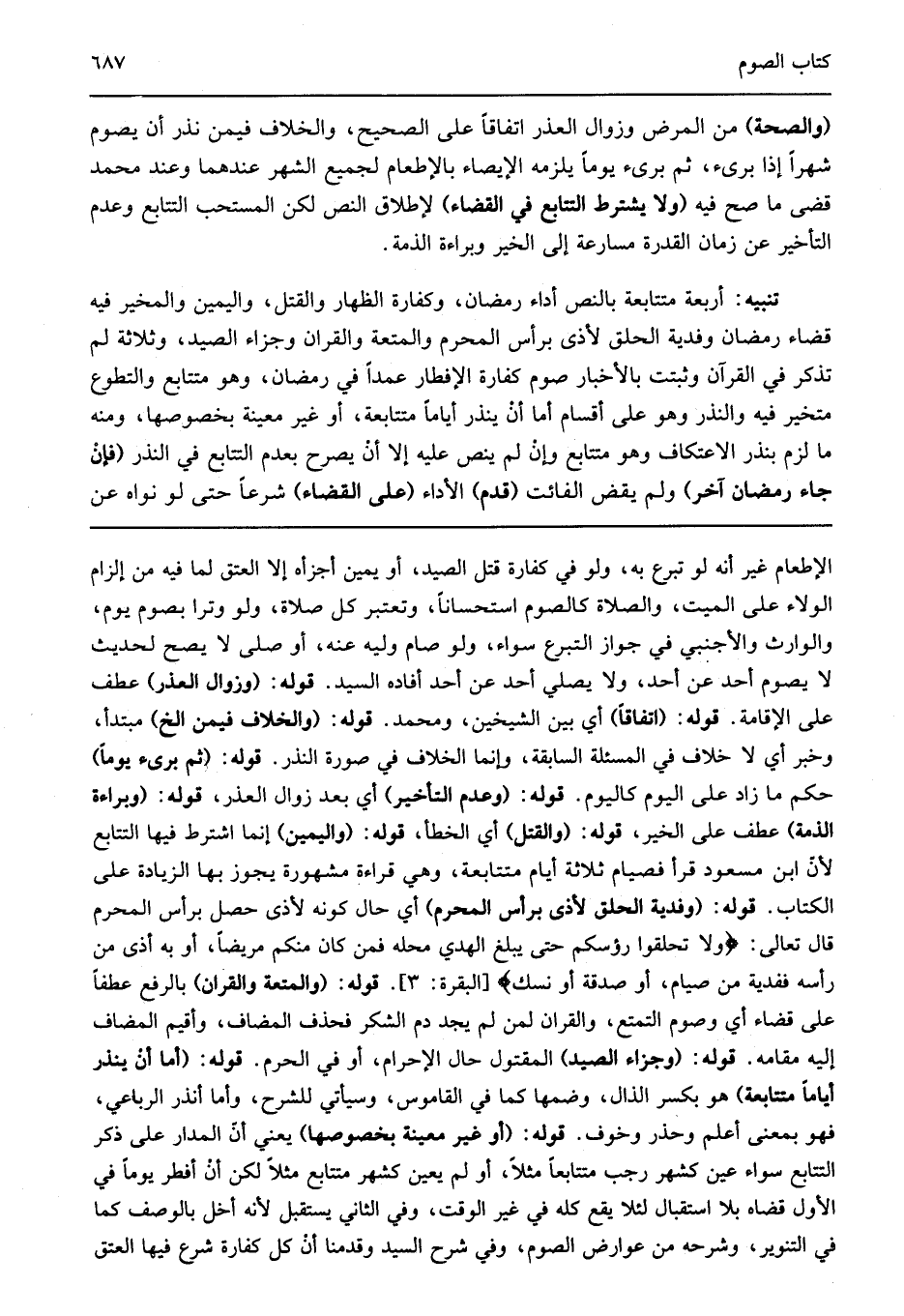 الإطعام غير أنه لو تبرع به ولو في كفارة قتل الصيد أو يمين أجزأه إلا العتق لما فيه من إلزام الولاء على الميت والصلاة كالصوم استحسانا وتعتبر كل صلاة ولو وترا بصوم يوم والوارث والأجنبي في جواز التبرع سواء ولو صام وليه عنه أو صلى لا يصح لحديث لا يصوم أحد عن أحد ولا يصلي أحد عن أحد أفاده السيد قوله: "وزوال العذر" عطف على الإقامة قوله: "اتفاقا" أي بين الشيخين ومحمد قوله: "والخلاف فيمن الخ" مبتدأ وخبر أي لا خلاف في المسئلة السابقة وإنما الخلاف في صورة النذر قوله: "ثم برىء يوما" حكم ما زاد على اليوم كاليوم قوله: "وعدم التأخير" أي بعد زوال العذر قوله: "وبراءة الذمة" عطف على الخير قوله: "والفتل" أي الخطأ قوله: "واليمين" إنما اشترط فيها التتابع لأن ابن مسعود قرأ فصيام ثلاثة أيام متتابعة وهي قراءة مشهورة يجوز بها الزيادة على الكتاب قوله: "وفدية الحلق لأذى برأس المحرم" أي حال كونه لأذى حصل برأس المحرم قال تعالى: {وَلا تَحْلِقُوا رُؤُوسَكُمْ حَتَّى يَبْلُغَ الْهَدْيُ مَحِلَّهُ فَمَنْ كَانَ مِنْكُمْ مَرِيضاً أَوْ بِهِ أَذىً مِنْ رَأْسِهِ فَفِدْيَةٌ مِنْ صِيَامٍ أَوْ صَدَقَةٍ أَوْ نُسُكٍ} [البقرة: 196] قوله: "والمتعة والقران" بالرفع عطفا على قضاء أي وصوم التمتع والقران لمن لم يجد دم الشكر فحذف المضاف وأقيم المضاف إليه مقامه قوله: "وجزاء الصيد" المقتول حال الإحرام أو في الحرم قوله: "أما أن ينذر أياما متتابعة" هو بكسر الذال وضمها كما في القاموس وسيأتي للشرح وأما أنذر الرباعي فهو بمعنى أعلم وحذر وخوف قوله: "أو غير معينة بخصوصها" يعني أن المدار على ذكر التتابع سواء عين كشهر رجب متتابعا مثلا أو لم يعين كشهر متتابع مثلا لكن أن أفطر يوما في الأول قضاه بلا استقبال لئلا يقع كله في غير الوقت وفي الثاني يستقبل لأنه أخل بالوصف كما في التنوير وشرحه من عوارض الصوم وفي شرح السيد وقدمنا أن كل كفارة شرع فيها العتق