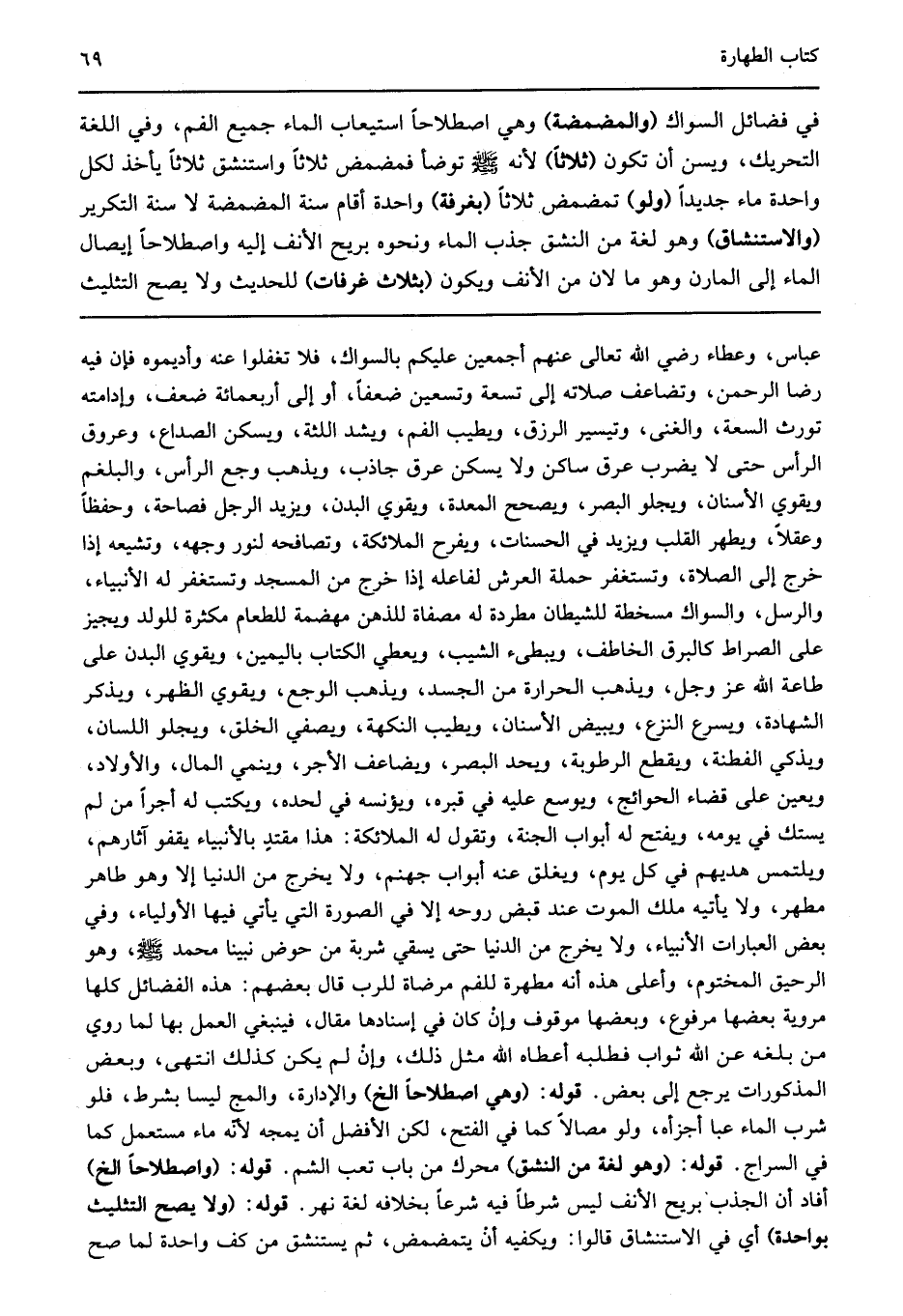 عباس وعطاء رضي الله تعالى عنهم أجمعين عليكم بالسواك فلا تغفلوا عنه وأديموه فإن فيه رضا الرحمن وتضاعف صلاته إلى تسعة وتسعين ضعفا أو إلى أربعمائة ضعف وإدامته تورث السعة والغنى وتيسير الرزق ويطيب الفم ويشد اللثة ويسكن الصداع وعروق الرأس حتى لا يضرب عرق ساكن ولا يسكن عرق جاذب ويذهب وجع الرأس والبلغم ويقوي الأسنان ويجلو البصر ويصحح المعدة ويقوي البدن ويزيد الرجل فصاحة وحفظا وعقلا ويطهر القلب ويزيد في الحسنات ويفرح الملائكة وتصافحه لنور وجهه وتشيعه إذا خرج إلى الصلاة وتستغفر حملة العرش لفاعله إذا خرج من المسجد وتستغفر له الأنبياء والرسل والسواك مسخطة للشيطان مطردة له مصفاة للذهن مهضمة للطعام مكثرة للولد ويجيز على الصراط كالبرق الخاطف ويبطىء الشيب ويعطي الكتاب باليمين ويقوي البدن على طاعة الله عز وجل ويذهب الحرارة من الجسد ويذهب الوجع ويقوي الظهر ويذكر الشهادة ويسرع النزع ويبيض الأسنان ويطيب النكهة ويصفي الخلق ويجلو اللسان ويذكي الفطنة ويقطع الرطوبة ويحد البصر ويضاعف الأجر وينمي المال والأولاد ويعين على قضاء الحوائج ويوسع عليه في قبره ويؤنسه في لحده ويكتب له أجرا من لم يستك في يومه ويفتح له أبواب الجنة وتقول له الملائكة هذا مقتد بالأنبياء يقفو آثارهم ويلتمس هديهم في كل يوم ويغلق عنه أبواب جهنم ولا يخرج من الدنيا إلا وهو طاهر مطهر ولا يأتيه ملك الموت عند قبض روحه إلا في الصورة التي يأتي فيها الأولياء وفي بعض العبارات الأنبياء ولا يخرج من الدنيا حتى يسقي شربة من حوض نبينا محمد صلى الله عليه وسلم وهو الرحيق المختوم وأعلى هذه أنه مطهرة للفم مرضاة للرب قال بعضهم هذه الفضائل كلها مروية بعضها مرفوع وبعضها موقوف وإن كان في إسنادها مقال فينبغي العمل بها لما روى من بلغه عن الله ثواب فطلبه أعطاه الله مثل ذلك وإن لم يكن كذلك انتهى وبعض المذكورات يرجع إلى بعض قوله: "وهي اصطلاحا الخ" والإدارة والمج ليسا بشرط فلو شرب الماء عبا أجزأه ولو مصا لا كما في الفتح لكن الأفضل أن يمجه لأنه ماء مستعمل كما في السراج قوله: "وهو لغة من النشق" محرك من باب تعب الشم قوله: "واصطلاحا الخ" أفاد أن الجذب بريح الأنف ليس شرطا فيه شرعا بخلافه لغة نهر قوله: "ولا يصح التثليث بواحدة" أي في الاستنشاق قالوا: ويكفيه أن يتمضمض ثم يستنشق كم من كف واحدة لما صح.