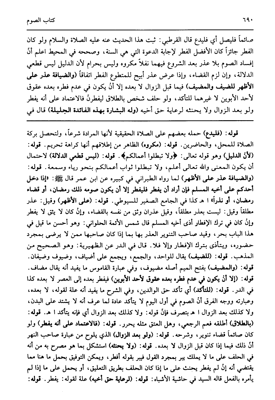قوله: "فليدع" حمله بعضهم على الصلاة الحقيقية لأنها المرادة شرعا ولتحصل بركة الصلاة للمحل والحاضرين قوله: "مكروه" الظاهر من إطلاقهم أنها كراهة تحريم قوله: "لأن الدليل" وهو قوله تعالى: {وَلا تُبْطِلُوا أَعْمَالَكُمْ} قوله: "ليس قطعي الدلالة" لاحتمال أن يكون المعنى والله تعالى أعلم ولا تبطلوا ثواب أعمالكم بنحو رياء وسمعة قوله: "والضيافة عذر على الأظهر" لما رواه الطبراني في كبيره عن ابن عمر قال صلى الله عليه وسلم: "إذا دخل أحدكم على أخيه المسلم فإن أراد أن يفطر فليفطر إلا أن يكون صومه ذلك رمضان أو قضاء رمضان أو نذرا" اهـ كذا في الجامع الصغير للسيوطي قوله: "على الأظهر" وقيل عذر مطلقا وقيل ليست بعذر مطلقا وقيل عذران وثق من نفسه بالقضاء وإن كان لا يثق لا يفطر وإن كان في ترك الإفطار أذى أخيه المسلم قال شمس الأئمة الحلواني وهو أحسن ما قيل في هذا الباب بحر وقيد صاحب التنوير العذر بها بما إذا كان صاحبها ممن لا يرضى بمجرد حضوره ويتأذى بترك الإفطار وإلا فلا قال في الدر عن الظهيرية وهو الصحيح من المذهب قوله: "للضيف" يقال للواحد والجمع ويجمع على أضياف وضيوف وضيفان قوله: "والمضيف" بفتح الميم أصله مضيوف وفي عبارة القاموس ما يفيد أنه يقال مضاف قوله: "إلا أن يكون في عدم فطره بعده عقوق لأحد الأبوين" فيفطر بعده إلى العصر لا بعده كذا في الدر قوله: "للتأكد" أي تأكد حق الوالدين وفي الشرح ما يفيد أنه علة لقوله لا بعده وعبارته ووجه الفرق أن الصوم في أول اليوم لا يتأكد عادة لما عرف أنه لا يشتد على البدن ولا كذلك بعد الزوال اهـ بتصرف فإن قوله ولا كذلك بعد الزوال أي فإنه يتأكد اهـ قوله: "بالطلاق" أطلقه فعم الرجعي وهل العتق مثله يحرر قوله: "فالاعتماد على أنه يفطر" ولو كان صائما قضاء تنوير وشرحه قوله: "ولو بعد الزوال" الذي يلوح من عبارة صاحب النهر أن ذلك فيما إذا كان قبل الزوال لا بعده قوله: "ولا يحنثه" استشكل بما هو مصرح به من أنه في الحلف على ما لا يملك يبر بمجرد القول فيبر بقوله أفطر ويمكن التوفيق بحمل ما هنا مما يقتضي أنه إن لم يفطر يحنث على ما إذا كان الحلف بطريق التعليق أو يحمل على ما إذا لم يأمره بالفعل قاله السيد في حاشية الأشباه قوله: "لرعاية حق أخيه" علة لقوله يفطر قوله: