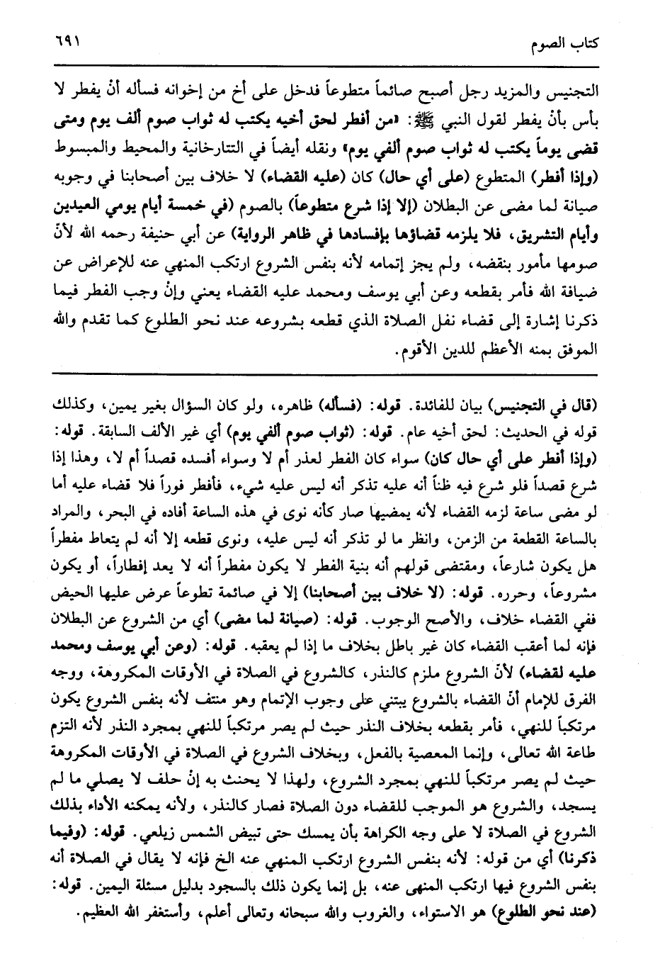 "قال في التجنيس" بيان للفائدة قوله: "فسأله" ظاهره ولو كان السؤال بغير يمين وكذلك قوله في الحديث لحق أخيه عام قوله: "ثواب صوم ألفي يوم" أي غير الألف السابقة قوله: "وإذا أفطر على أي حال كان" سواء كان الفطر لعذر أم لا وسواء أفسده قصدا أم لا وهذا إذا شرع قصدا فلو شرع فيه ظنا أنه عليه تذكر أنه ليس عليه شيء فأفطر فورا فلا قضاء عليه أما لو مضى ساعة لزمه القضاء لأنه يمضيها صار كأنه نوى في هذه الساعة أفاده في البحر والمراد بالساعة القطعة من الزمن وانظر ما لو تذكر أنه ليس عليه ونوى قطعه إلا أنه لم يتعاط مفطرا هل يكون شارعا ومقتضى قولهم أنه بنية الفطر لا يكون مفطرا أنه لا يعد إفطارا أو يكون مشروعا وحرره قوله: "لا خلاف بين أصحابنا" إلا في صائمة تطوعا عرض عليها الحيض ففي القضاء خلاف والأصح الوجوب قوله: "صيانة لما مضى" أي من الشروع عن البطلان فإنه لما أعقب القضاء كان غير باطل بخلاف ما إذا لم يعقبه قوله: "وعن أبي يوسف ومحمد عليه لقضاء" لأن الشروع ملزم كالنذر كالشروع في الصلاة في الأوقات المكروهة ووجه الفرق للإمام أن القضاء بالشروع يبتني على وجوب الإتمام وهو منتف لأنه بنفس الشروع يكون مرتكبا للنهي فأمر بقطعه بخلاف النذر حيث لم يصر مرتكبا للنهي بمجرد النذر لأنه التزم طاعة الله تعالى وإنما المعصية بالفعل وبخلاف الشروع في الصلاة في الأوقات المكروهة حيث لم يصر مرتكبا للنهي بمجرد الشروع ولهذا لا يحنث به إن حلف لا يصلي ما لم يسجد والشروع هو الموجب للقضاء دون الصلاة فصار كالنذر ولأنه يمكنه الأداء بذلك الشروع في الصلاة لا على وجه الكراهة بأن يمسك حتى تبيض الشمس زيلعي قوله: "وفيما ذكرنا" أي من قوله لأنه بنفس الشروع ارتكب المنهي عنه الخ فإنه لا يقال في الصلاة أنه بنفس الشروع فيها ارتكب المنهى عنه بل إنما يكون ذلك بالسجود بدليل مسئلة اليمين قوله: "عند نحو الطلوع" هو الاستواء والغروب والله سبحانه وتعالى أعلم وأستغفر الله العظيم.